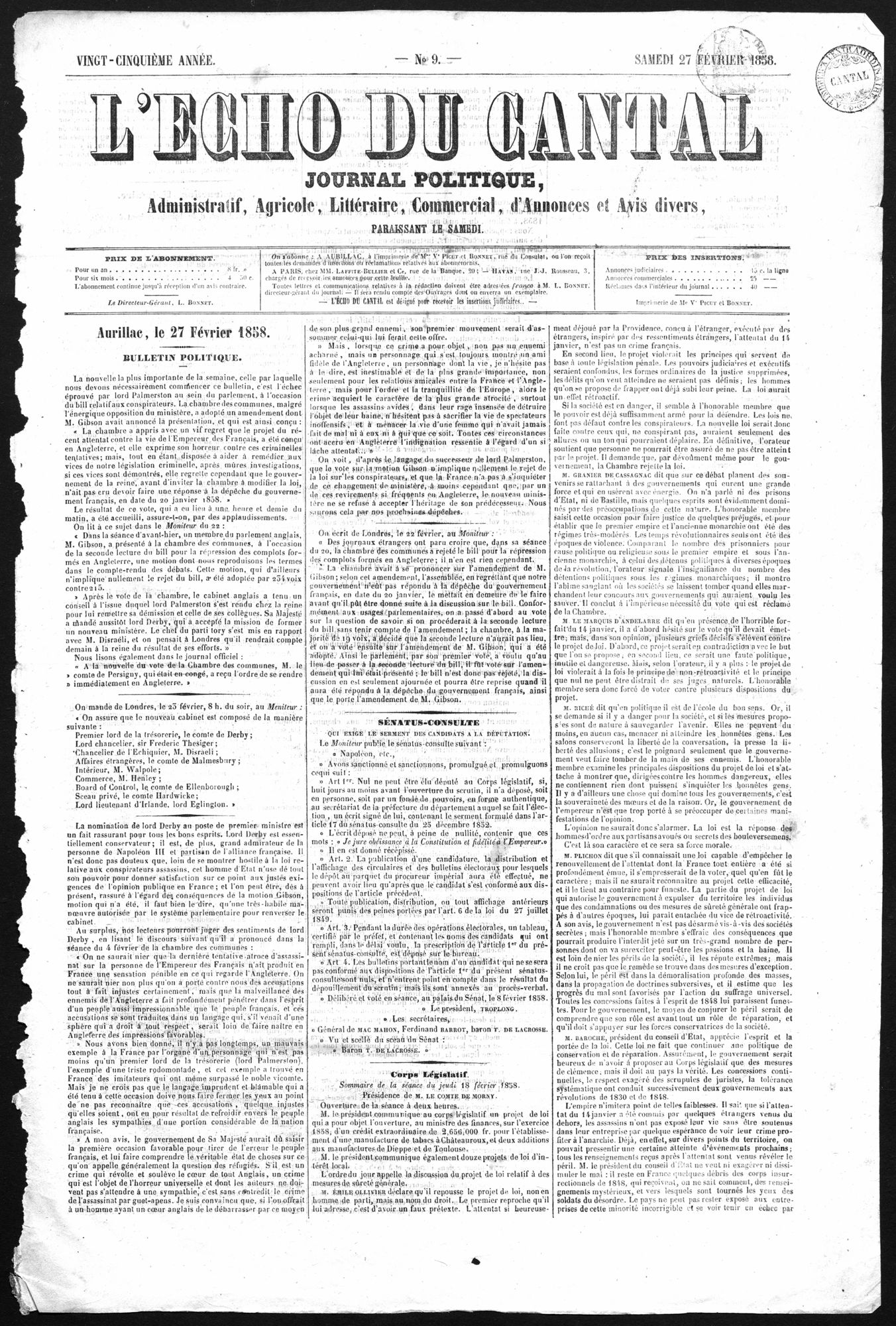 n° 9 : 27 février 1858, 2 JOUR 7, 1858, L'Echo du Cantal, Presse numérisée
