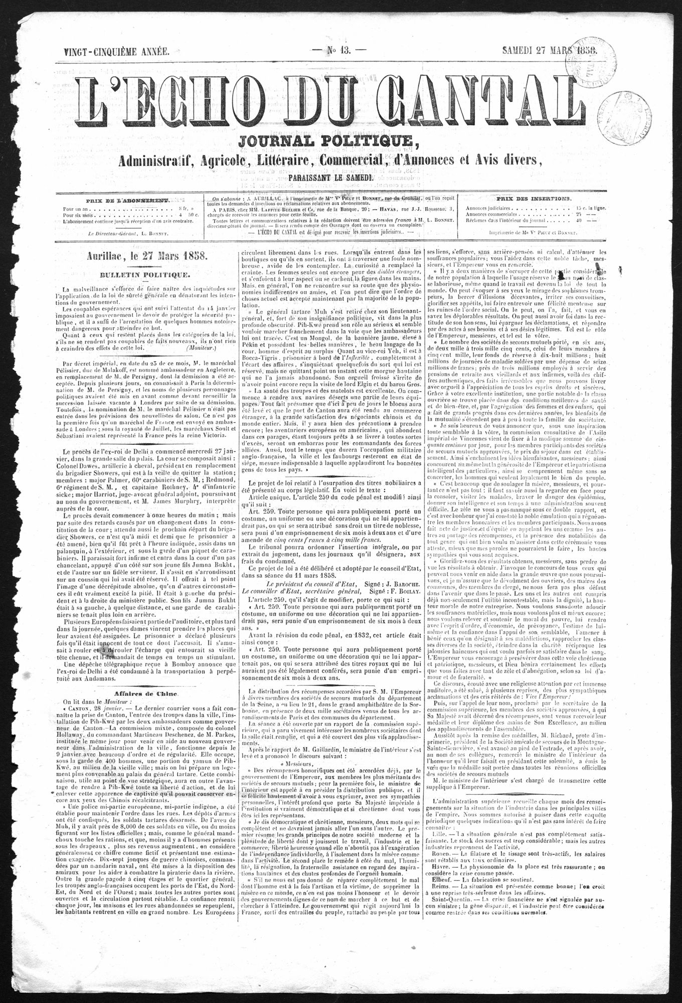 n° 13 : 27 mars 1858, 2 JOUR 7, 1858, L'Echo du Cantal, Presse numérisée