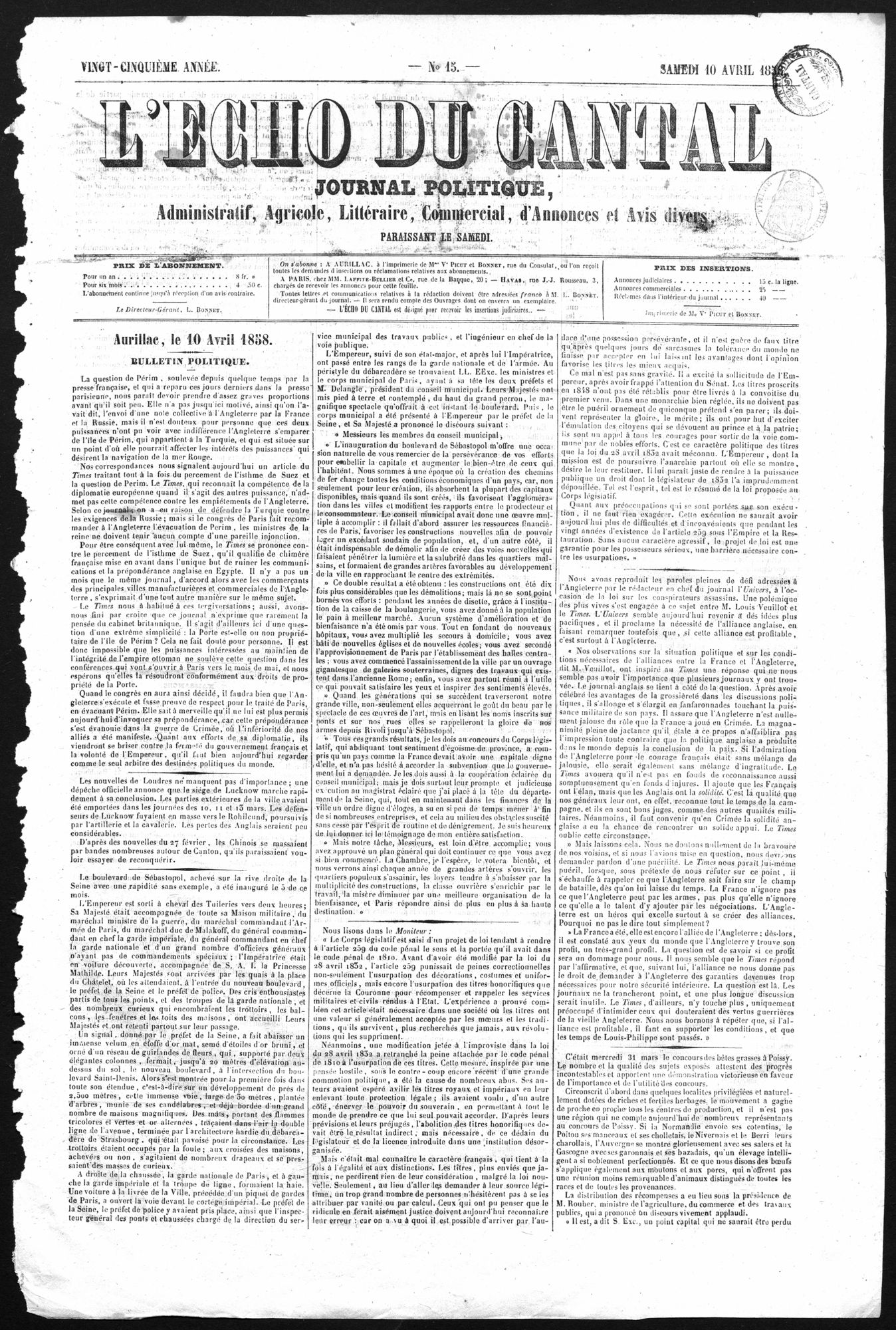 n° 15 : 10 avril 1858, 2 JOUR 7, 1858, L'Echo du Cantal, Presse numérisée