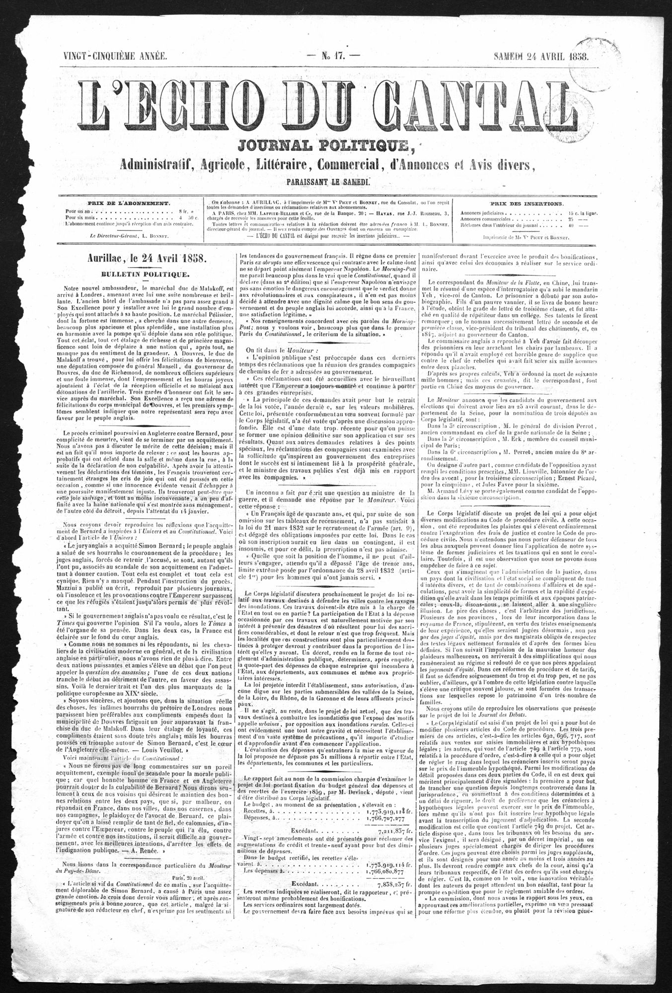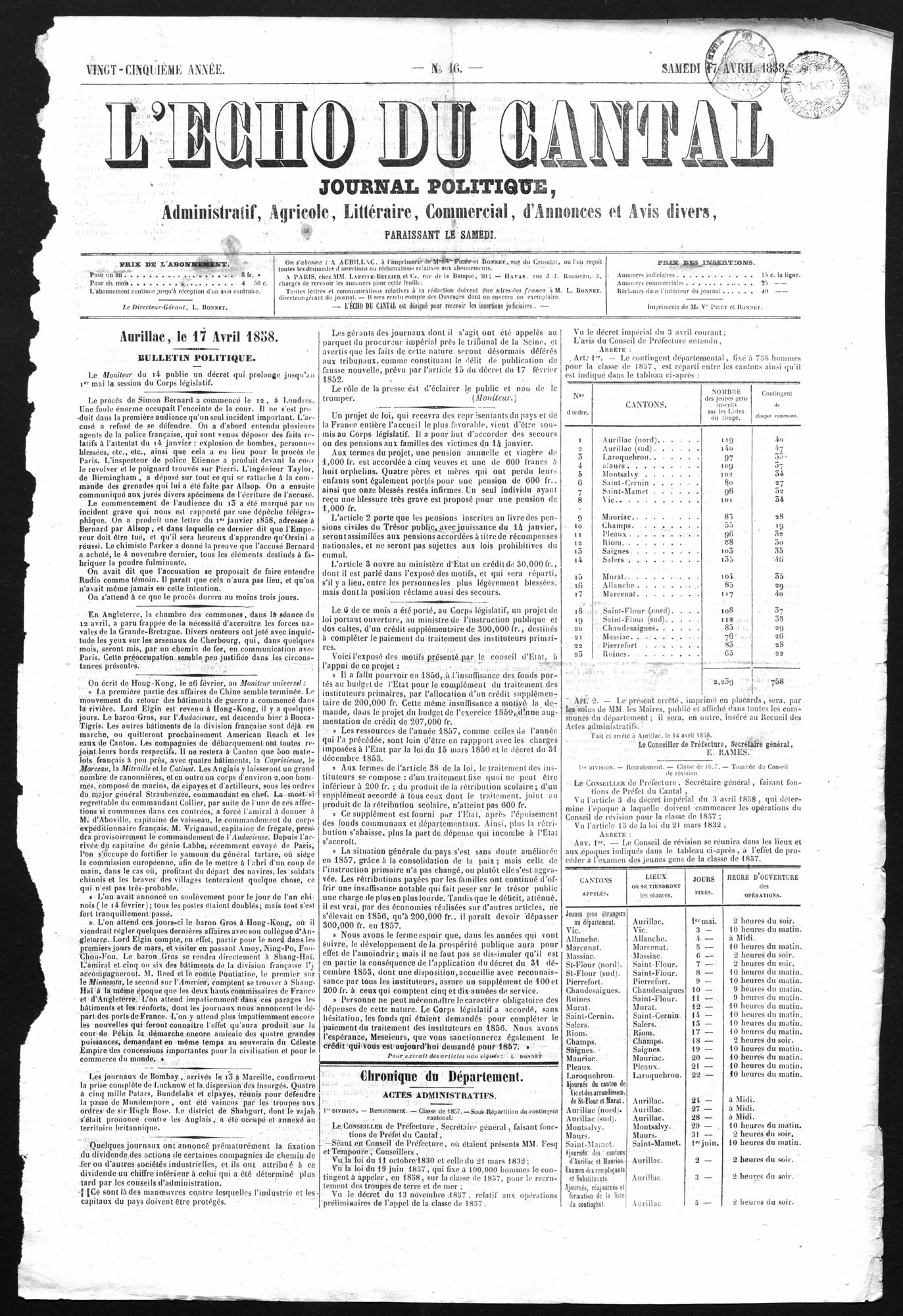 n° 17 : 24 avril 1858, 2 JOUR 7, 1858, L'Echo du Cantal, Presse numérisée