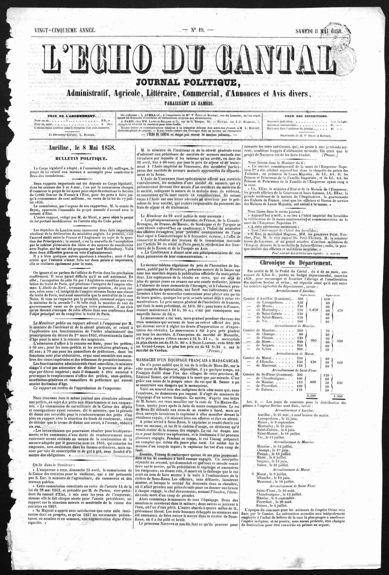 n° 19 : 8 mai 1858, 2 JOUR 7, 1858, L'Echo du Cantal, Presse numérisée