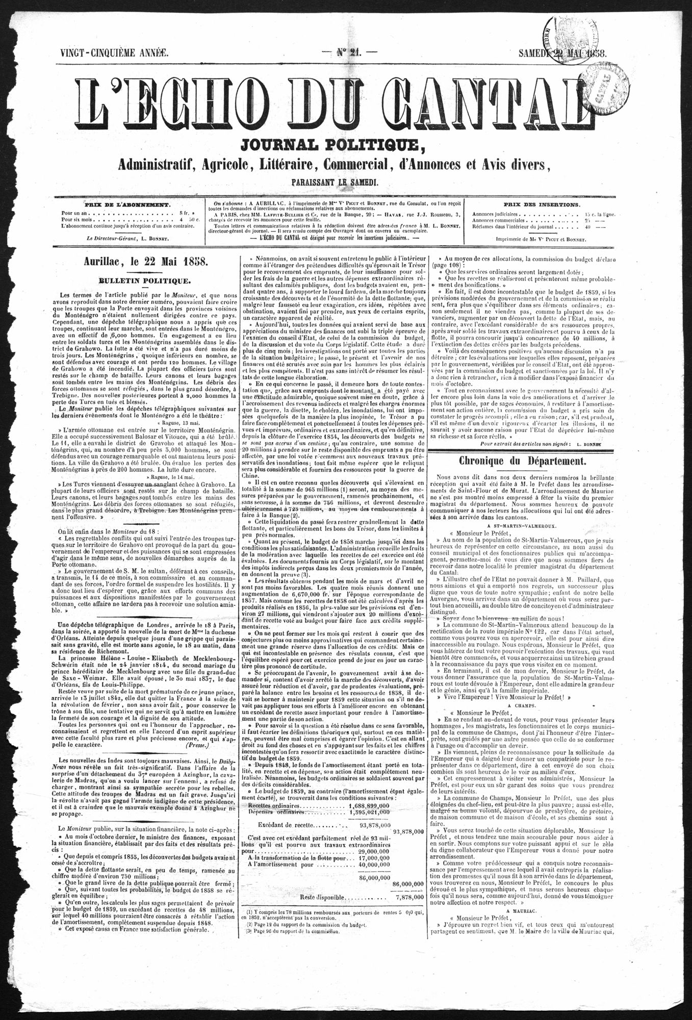 n° 21 : 22 mai 1858, 2 JOUR 7, 1858, L'Echo du Cantal, Presse numérisée
