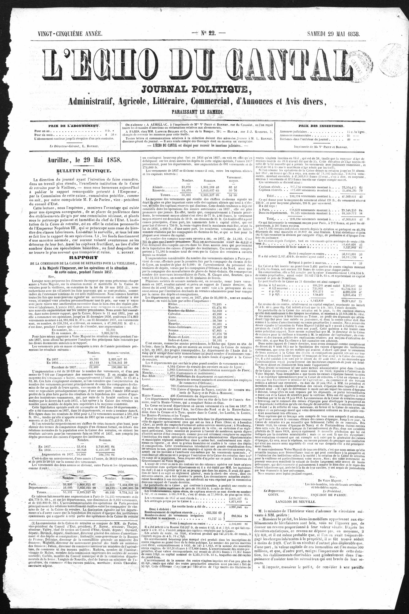 n° 22 : 29 mai 1858, 2 JOUR 7, 1858, L'Echo du Cantal, Presse numérisée