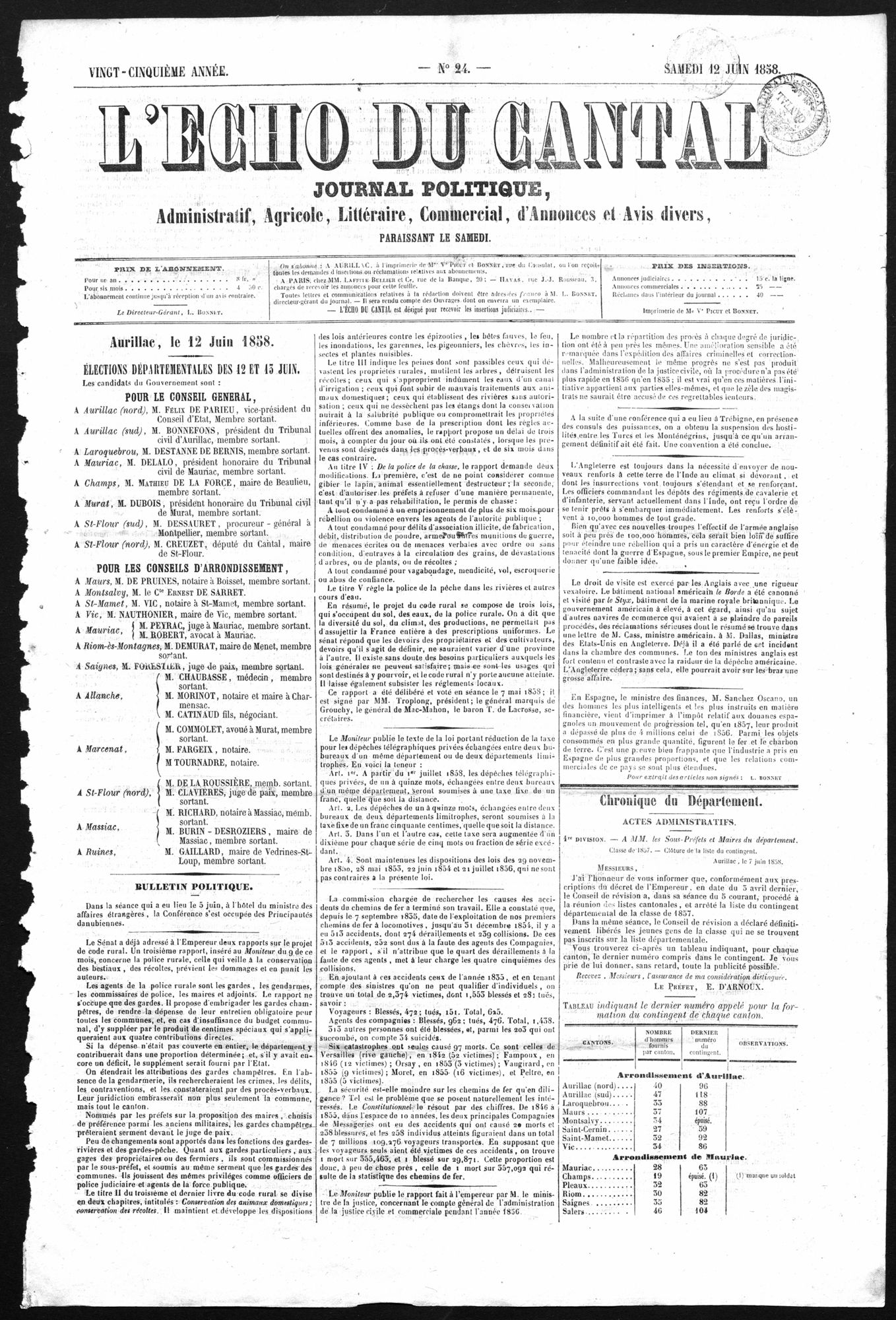 n° 24 : 12 juin 1858, 2 JOUR 7, 1858, L'Echo du Cantal, Presse numérisée