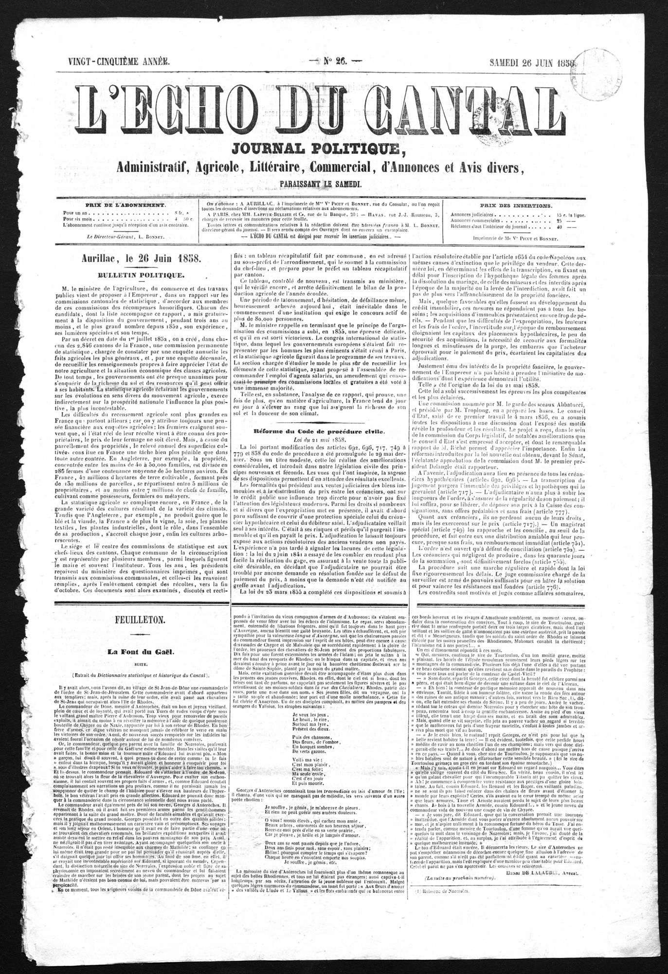 n° 26 : 26 juin 1858, 2 JOUR 7, 1858, L'Echo du Cantal, Presse numérisée