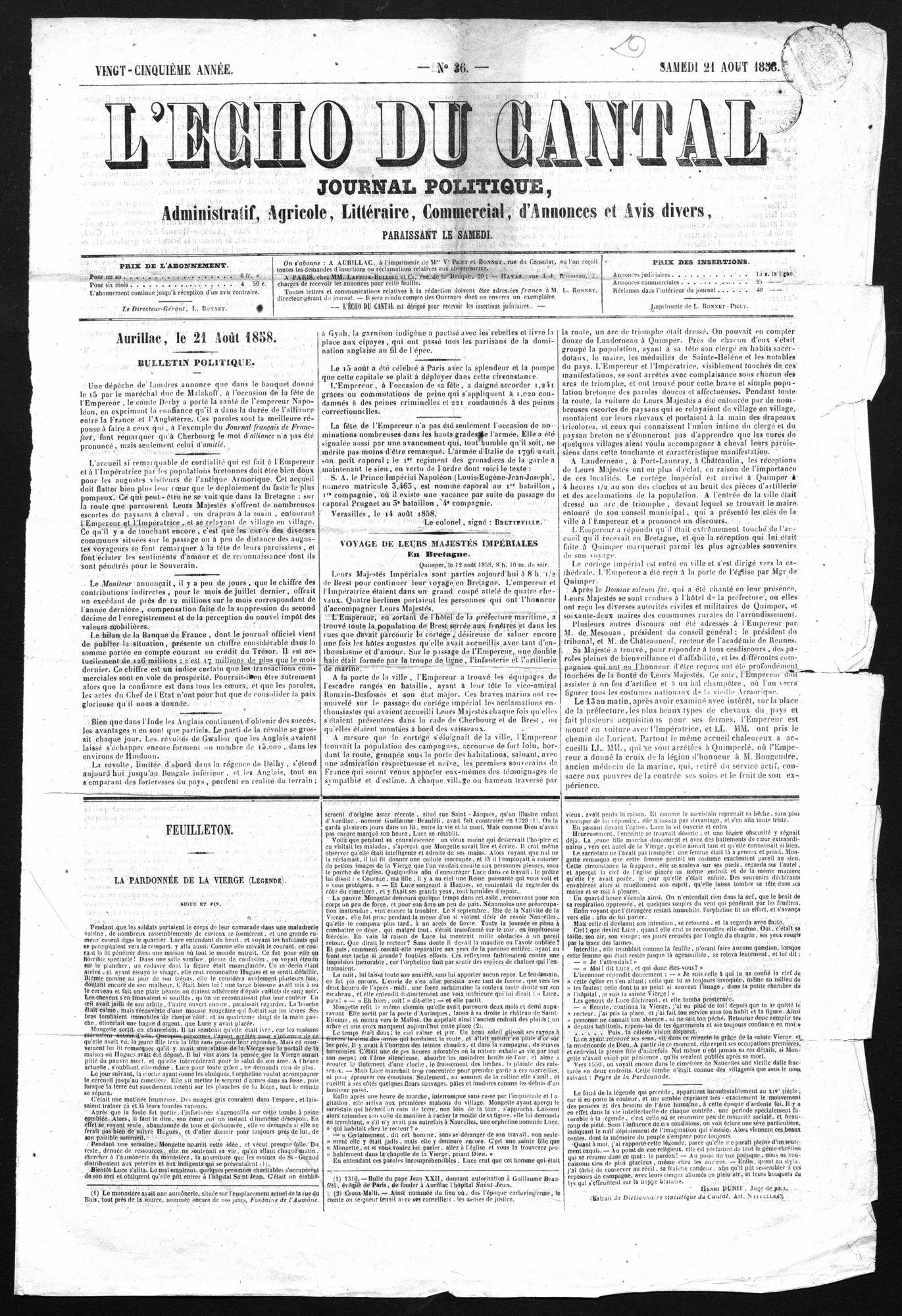 n° 36 : 21 août 1858, 2 JOUR 7, 1858, L'Echo du Cantal, Presse numérisée