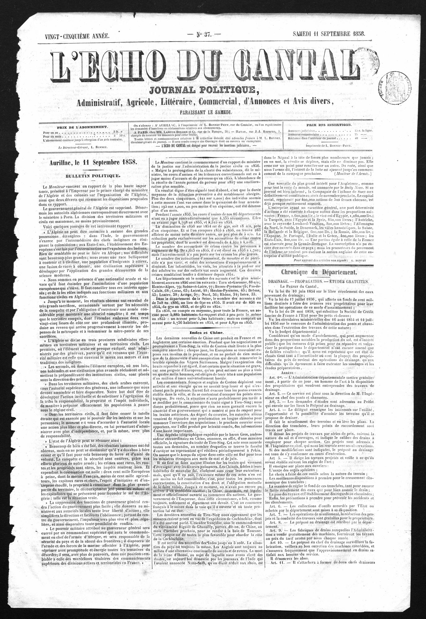 n° 37 : 11 septembre 1858, 2 JOUR 7, 1858, L'Echo du Cantal, Presse numérisée