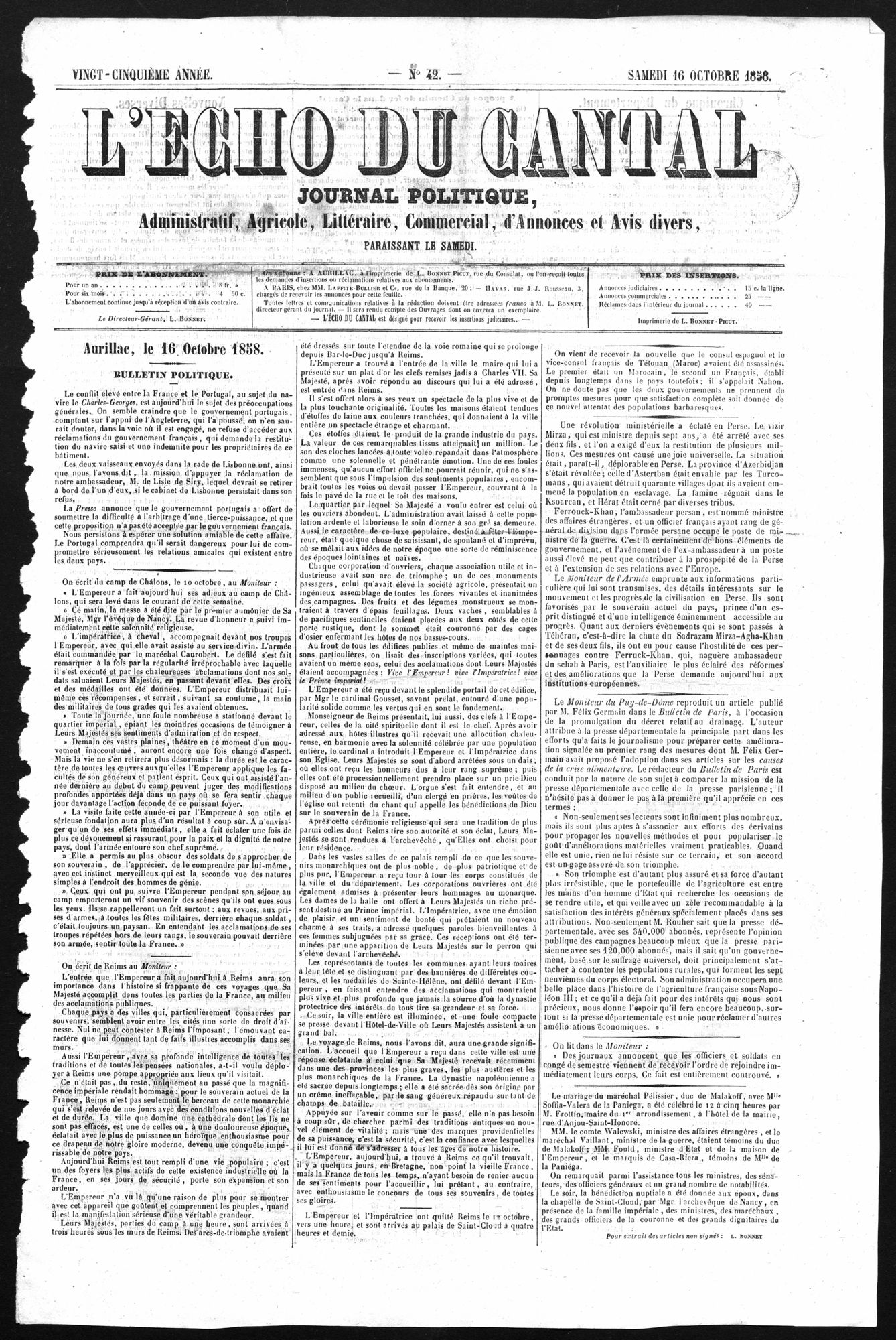 Le Moniteur du Cantal est créé le 22 décembre 1858 suite à la fusion de l'Echo du Cantal et de La Revue du Cantal