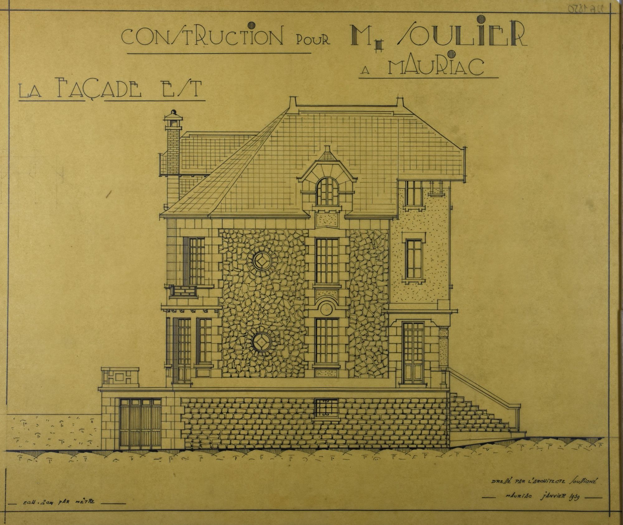 93 Fi 1850,"Construction pour M. Soulier à Mauriac. Façade est".