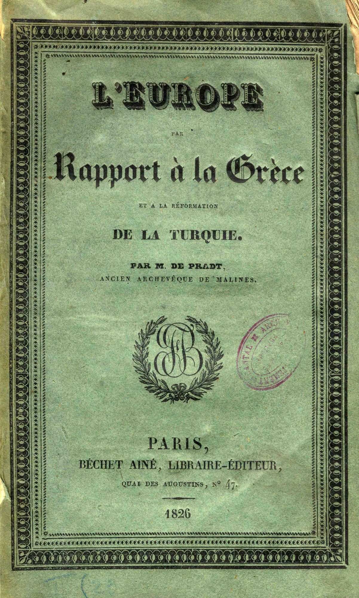 Au moment de la crise grecque, l'abbé, qui n'y a jamais mis les pieds, écrit un essai intitulé "L'Europe par rapport à la Grèce et à la réformation de la Turquie" (1826).