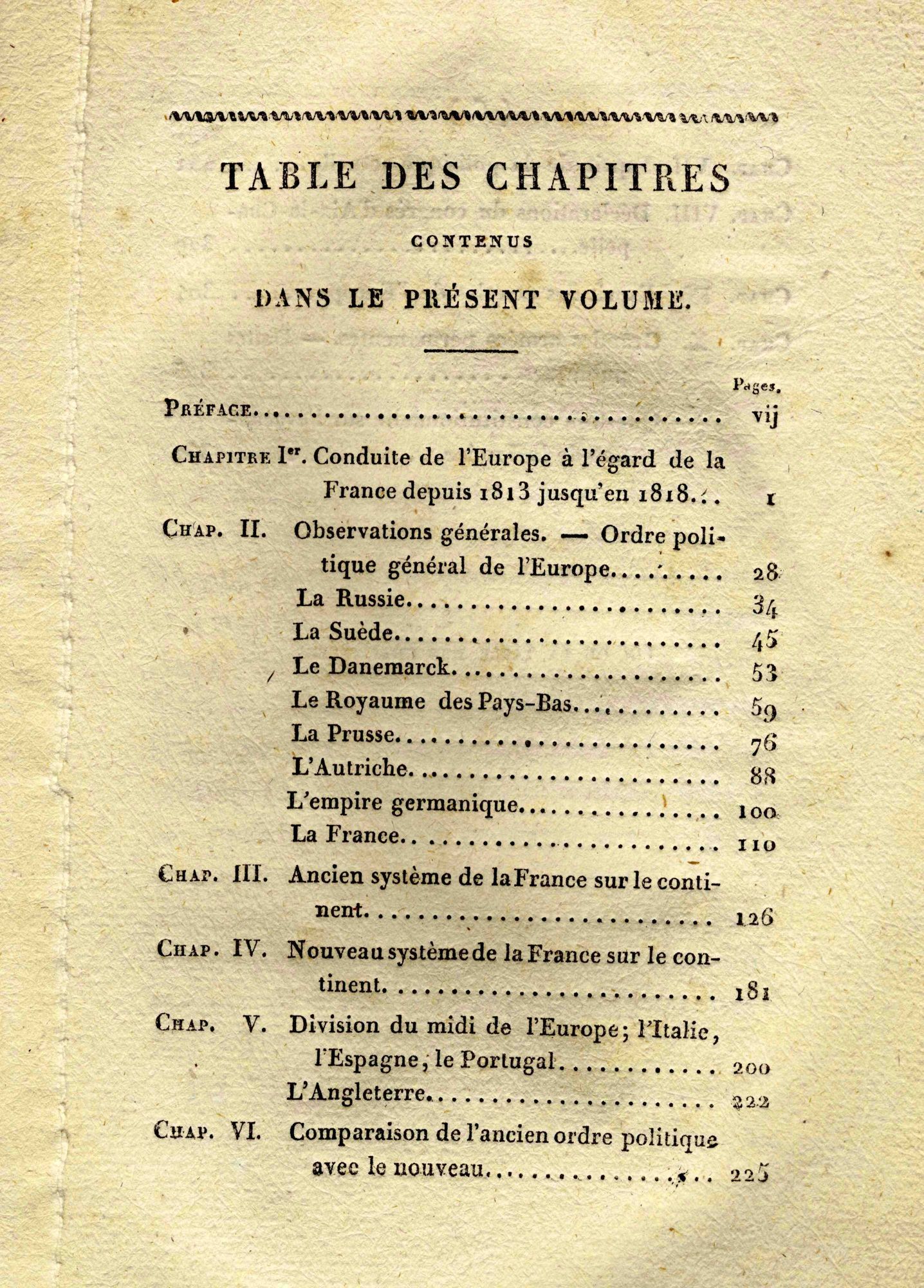 La table des matières de "L'Europe après le congrès d'Aix-la-Chapelle", réédité en 1828 dans les "Œuvres politiques de M. de Pradt", montre que l'abbé avait des idées sur tous les pays d'Europe.