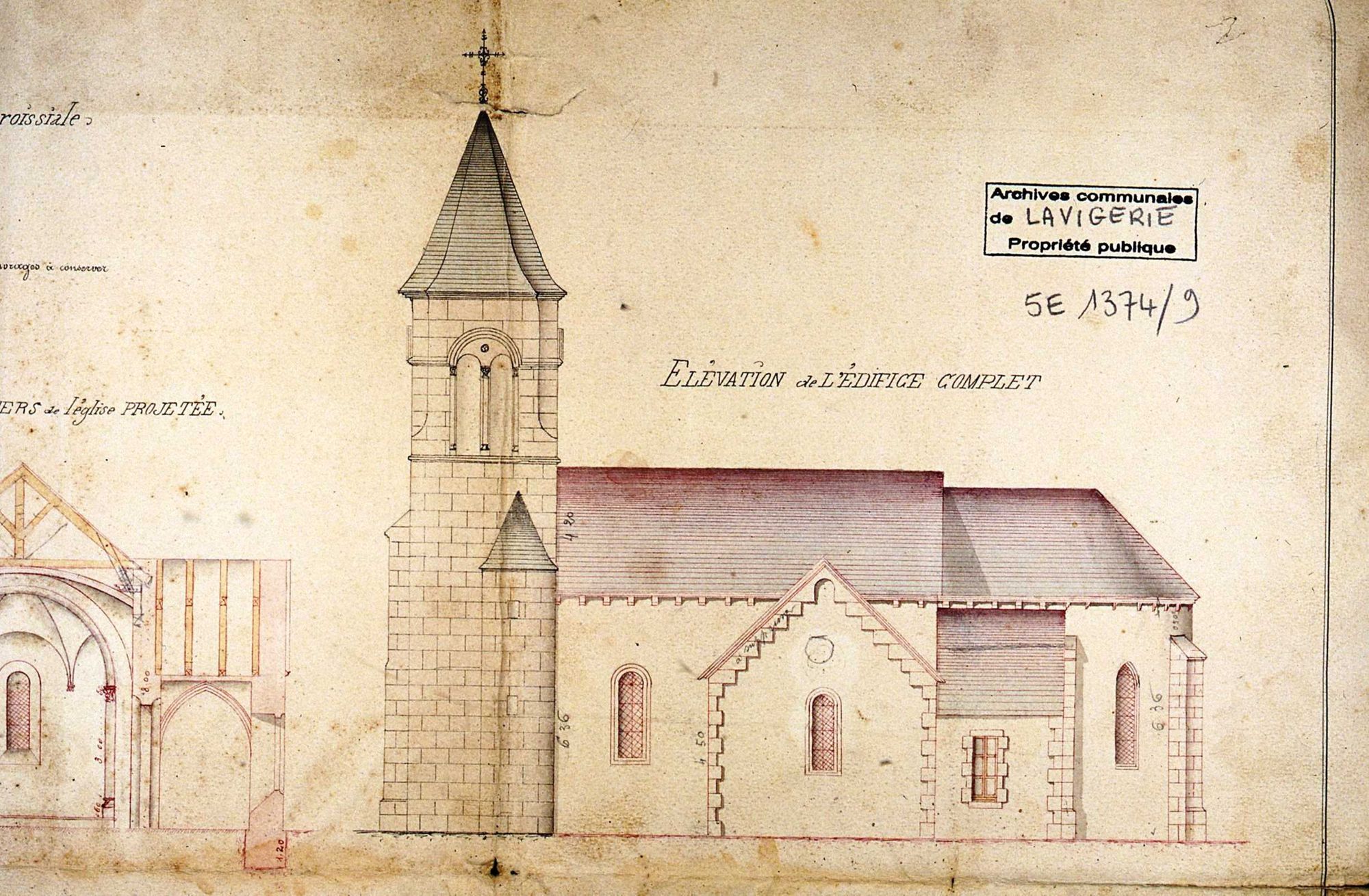 10 PH 787, Commune de Lavigerie, projet de reconstruction de l'église paroissiale : élévation de l'édifice complet / Serre. Arch.