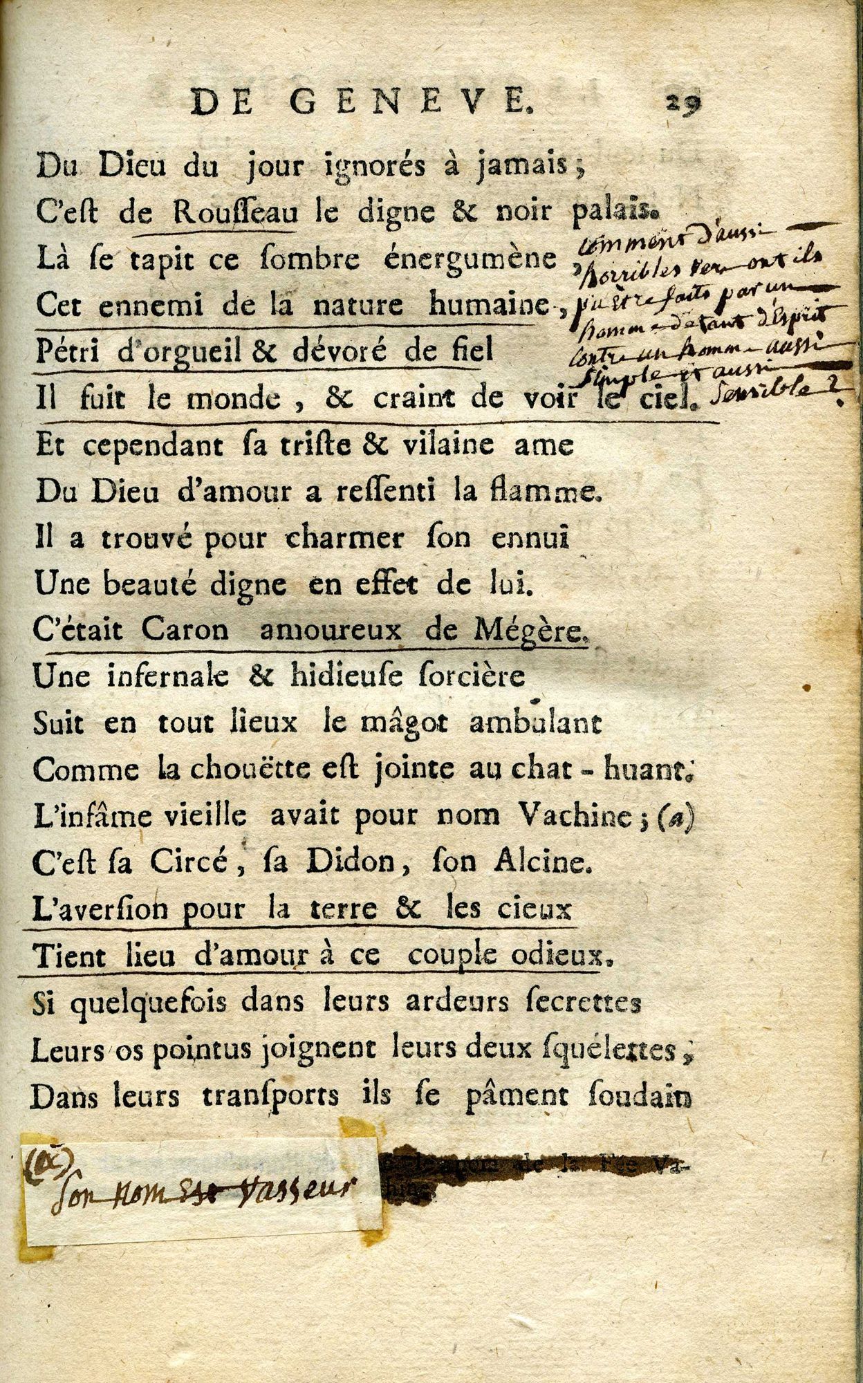 Là où Voltaire décrit le "noir palais" de Rousseau : "Là se tapit ce sombre énergumène,/ Cet ennemi de la nature humaine,/ Pétri d'orgueil et dévoré de fiel/ Il fuit le monde, & craint de voir le ciel", l'annotateur commente : "Comment d'aussi horribles vers ont-ils pu être faits par un homme d'autant d'esprit et aussi sensible ?".