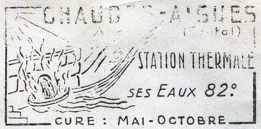 65 J 24-70 à 76/71, 1965 : 1 modèle Description - image : à gauche la source du Par coule en dégageant de la vapeur. Deux cours d'eau partent de la source vers la droite, l'un vers le haut, l'autre vers le bas. En haut à gauche, le soleil et ses rayons. Au centre, une montagne et deux conifères. - texte : Chaudes-Aigues (Cantal), station thermale, ses eaux 82°, cure : mai - octobre