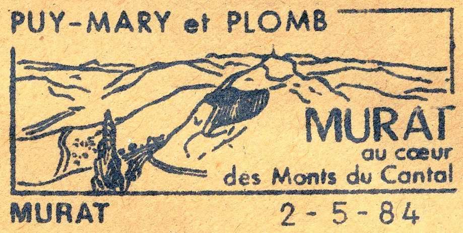 65 J 24-158 à 184/170, 1984 : 1 modèle Description - image : chaîne de montagne avec le rocher de Bonnevie. En bas à droite, on distingue furtivement la ville de Murat et une plante au premier plan. - texte : Puy Mary et Plomb, Murat au cœur des Monts du Cantal
