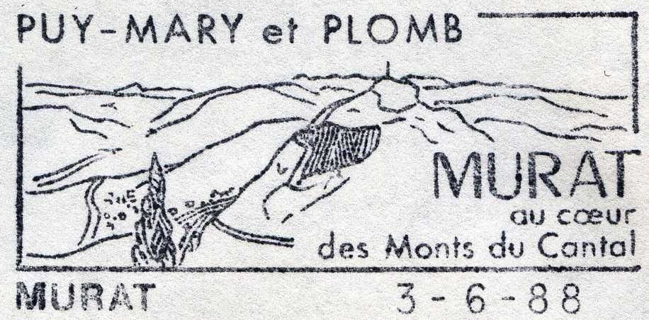 65 J 24-158 à 184/174, 1988 : 1 modèle Description - image : chaîne de montagne avec le rocher de Bonnevie. En bas à droite, on distingue furtivement la ville de Murat et une plante au premier plan. - texte : Puy Mary et Plomb, Murat au cœur des Monts du Cantal
