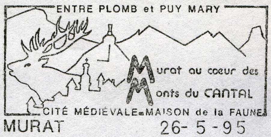 65 J 24-158 à 184/178, 1995 : 1 modèle Description - image : silhouette de la ville de Murat et du rocher de Bonnevie. En arrière-plan les montagnes. A gauche, une tête de cerf avec ses bois - texte : entre Plomb et Puy Mary, Murat au cœur des Monts Cantaliens, cité médiévale, maison de la faune