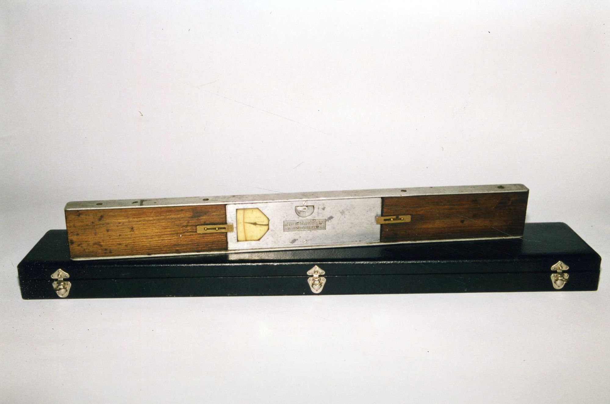 1989 W 246, Exposition d'outils et d'instruments topographiques anciens à la subdivision de Mauriac : nivomètre, machine à calculer, pantomètre, niveau, cercle d'alignement, niveau de chantier du type Goulier, lanternes à pétrole, équerre, chaîne à ruban, altimètre et livret de cantonnier