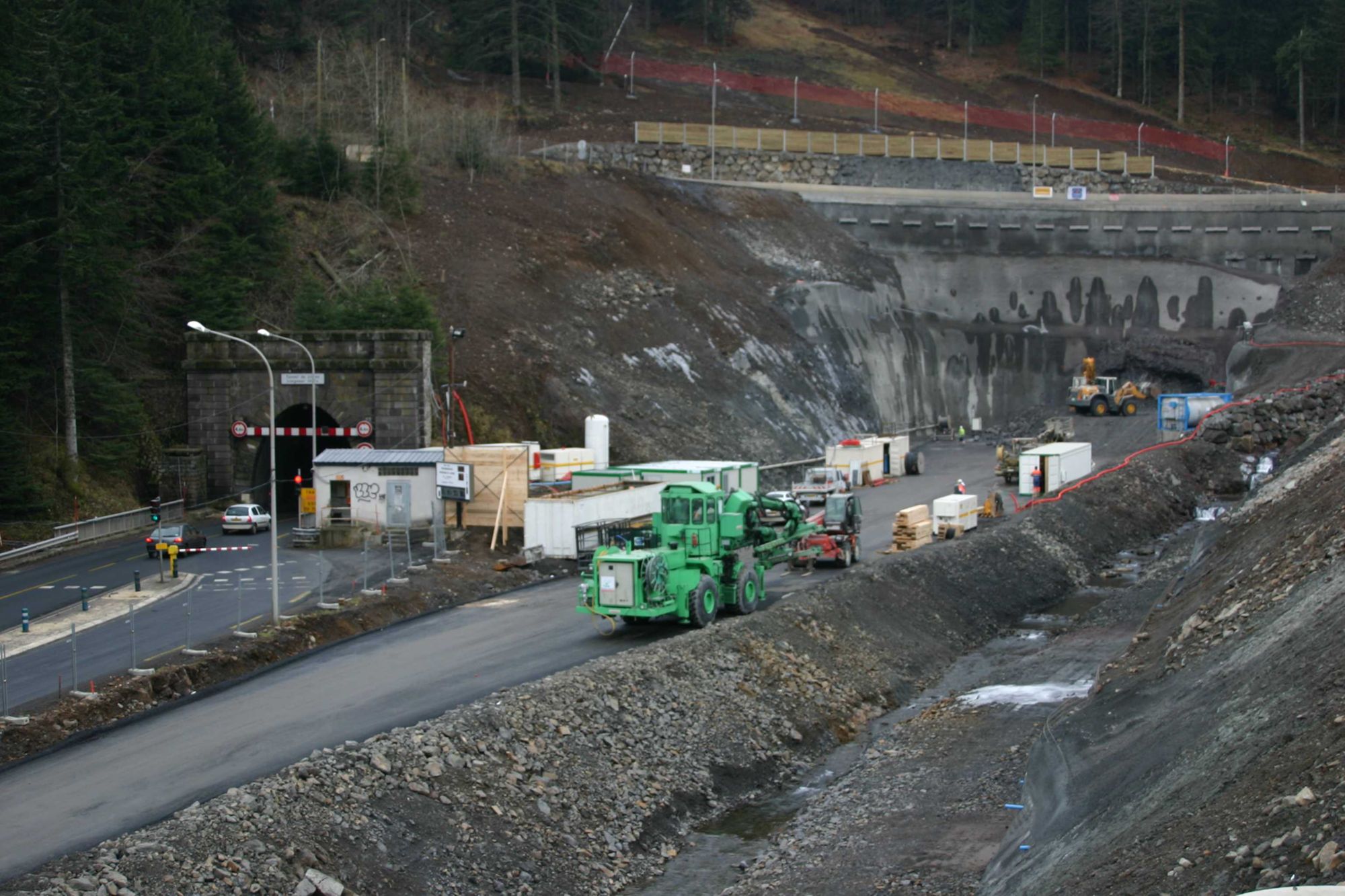1989 W 549, Vue d'ensemble du chantier, construction d'un bassin anti-pollution, fraise rotative permettant d'affiner la section minée, début du percement au brise-roche, installation de la centrale à béton et rétablissement de la piste de ski de fond et aménagement de la route départementale n° 67 (tête de Murat)