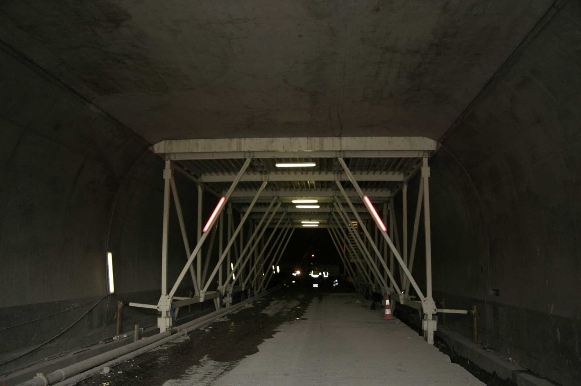 1989 W 574, Bétonnage de la dalle plafond réalisé à l'aide d'une dalle coffrante avec ferraillage : une pompe envoie le béton de la "toupie" sur la table coffrante où il est aussitôt mis en oeuvre par de nombreux ouvriers. Le premier plot (20 m) de la dalle plafond a été réalisé, celle-ci permettra la réalisation de deux gaines de ventilation. Voûte en béton et outils coffrant de raccordement des niches d'incendie ou de secours et des galeries de secours.