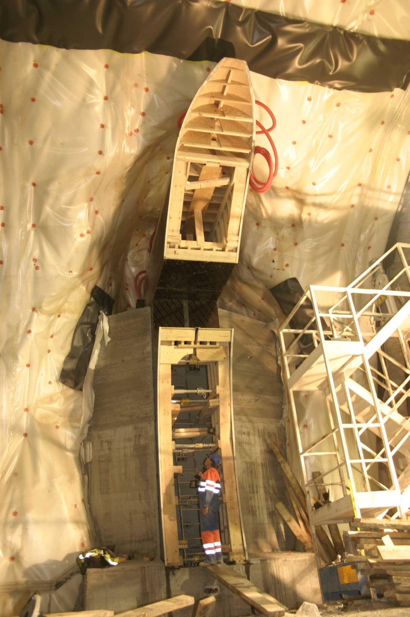 1989 W 577, Coffrage de la niche d'accès aux gaines avant bétonnage du plot, coffrage de l'aire de retournement (milieu du tunnel), vues d'ensemble du tunnel avec éclairage, table coffrante servant à la réalisation de la dalle plafond, raccordement d'une galerie de secours au nouveau tunnel, coffrage de niches de sécurité, installation des différents réseaux (eau, air, fourreaux, collecteurs...).