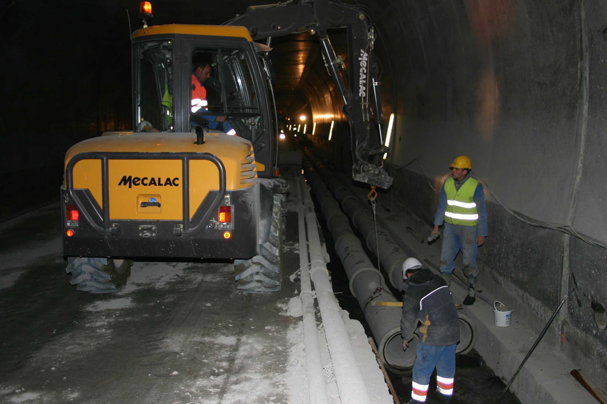 1989 W 582, Installation des différents réseaux (eau, air, fourreaux, collecteurs...), coulage des banquettes et des trottoirs, construction du centre de secours, les galeries de secours sont achevées, entrée du tunnel côté Murat, plan d'eau et zone de loisir réalisée sur la zone de dépôt des Sagnes (?)