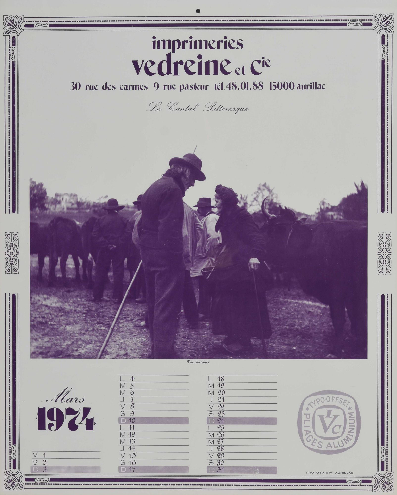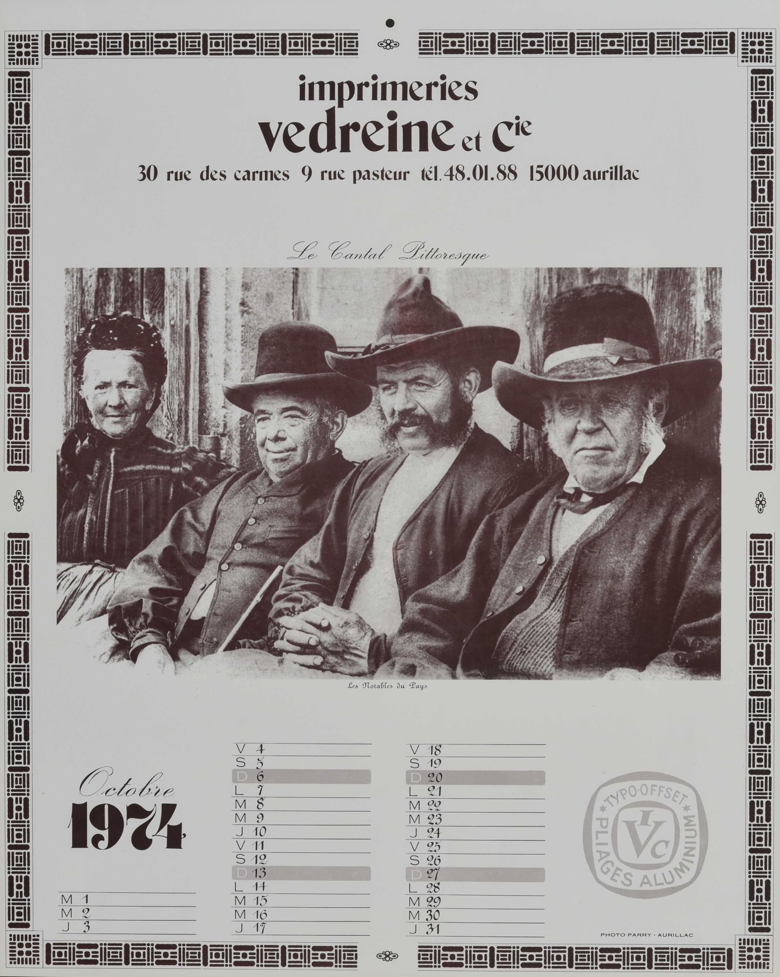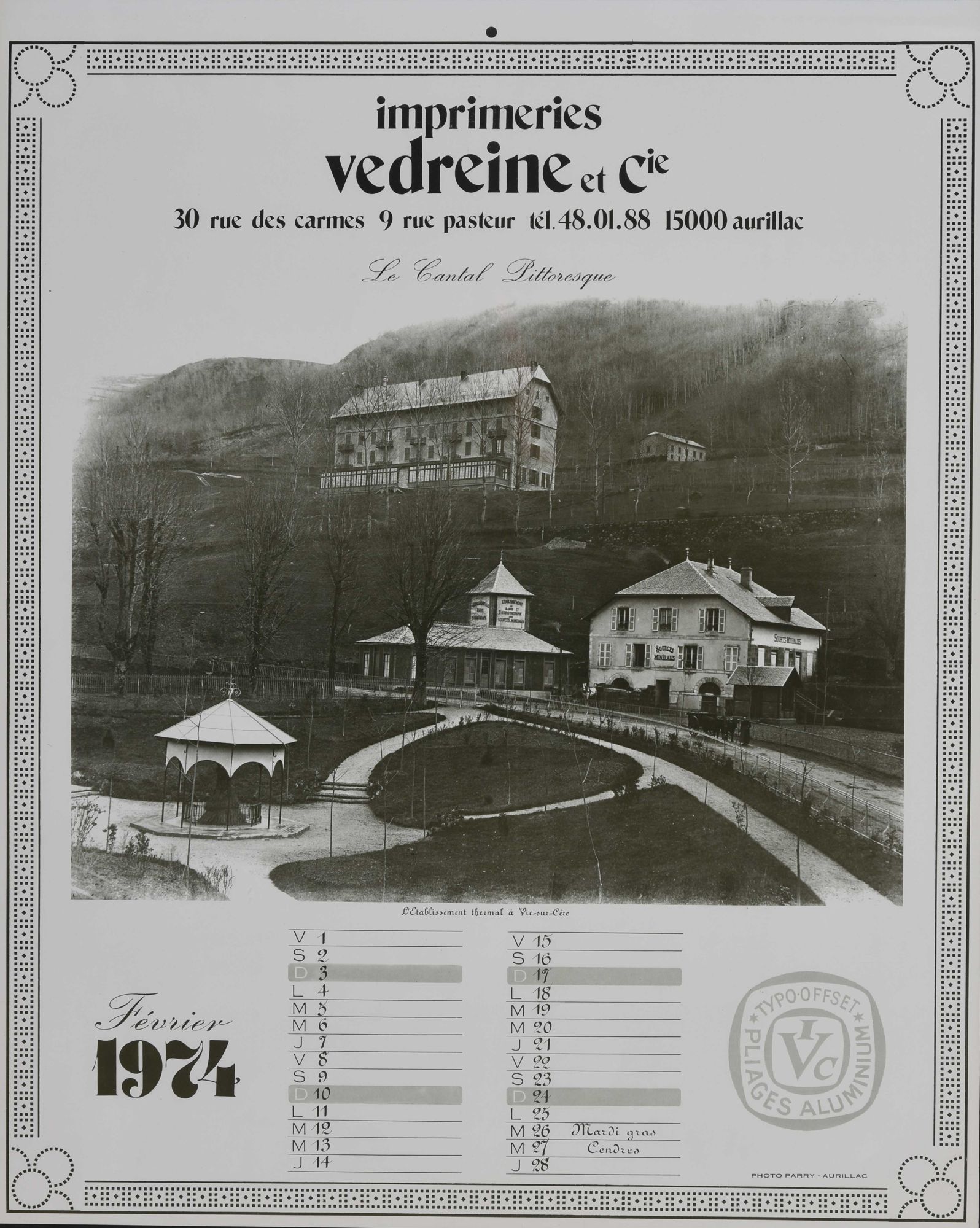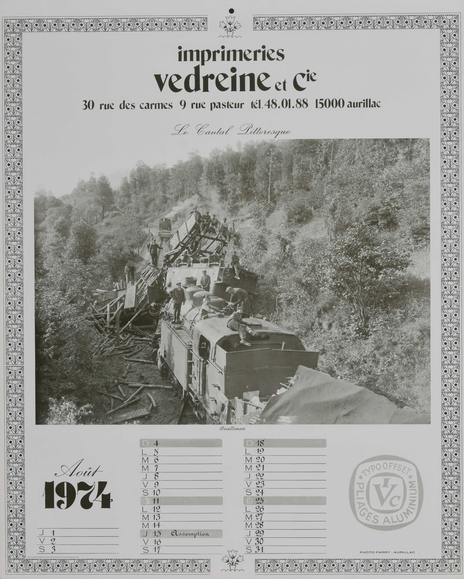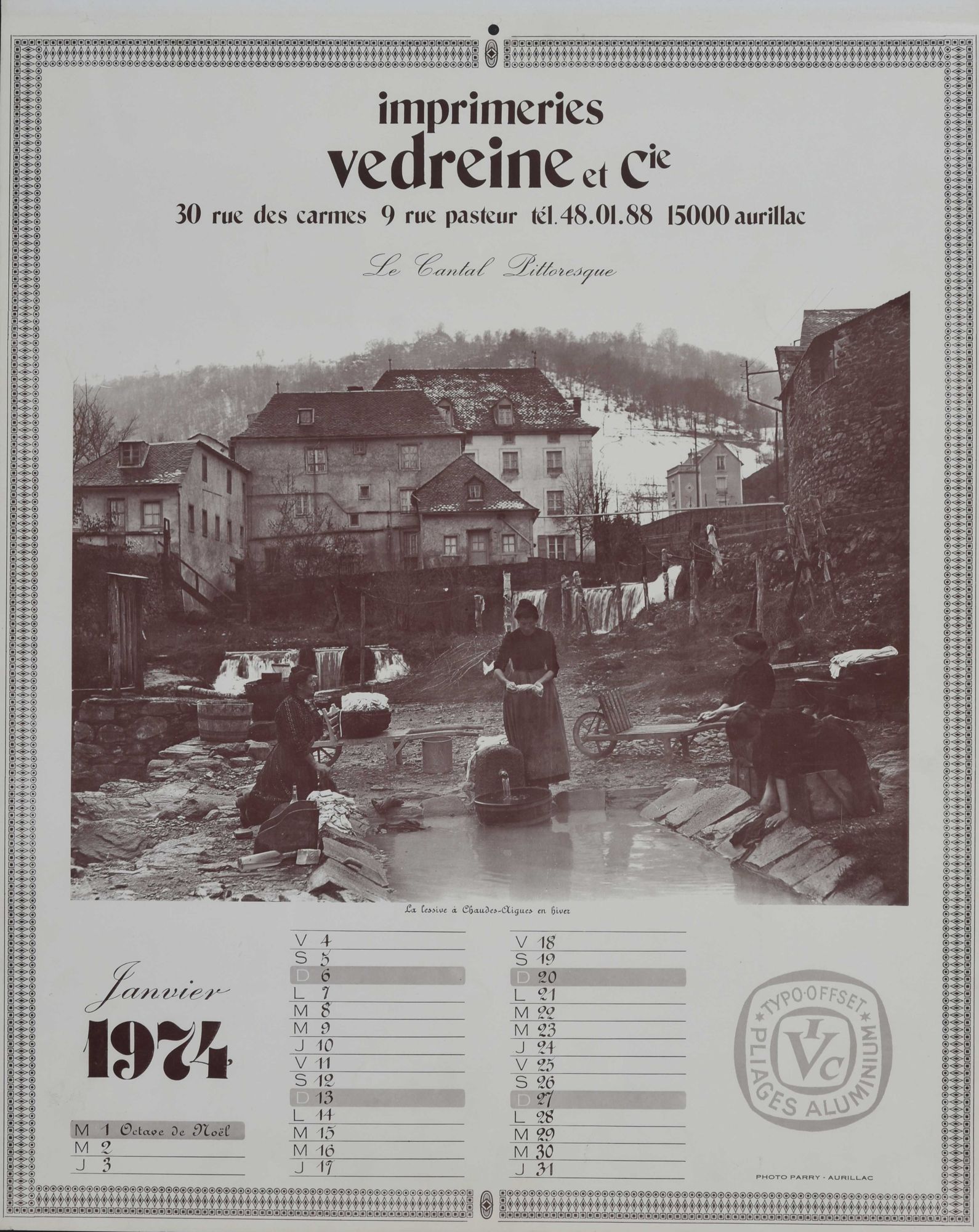 Janvier : "La lessive à Chaudes-Aigues en hiver" ; février : "L'établissement thermal à Vic-sur-Cère" ; mars : "Transactions" ; avril : "Le château de Laroquebrou" ; mai : "Le château de Branzac" ; juin : "L'arrivée du sapin du square d'Aurillac" ; juillet : "Aurillac : vue générale" ; août : "Déraillement" ; septembre : "Le palais de justice à Aurillac" ; octobre : "Les notables du pays" ; novembre : "Le château de Clavières d'Ayrens" ; décembre : "Saint-Flour : vue générale".