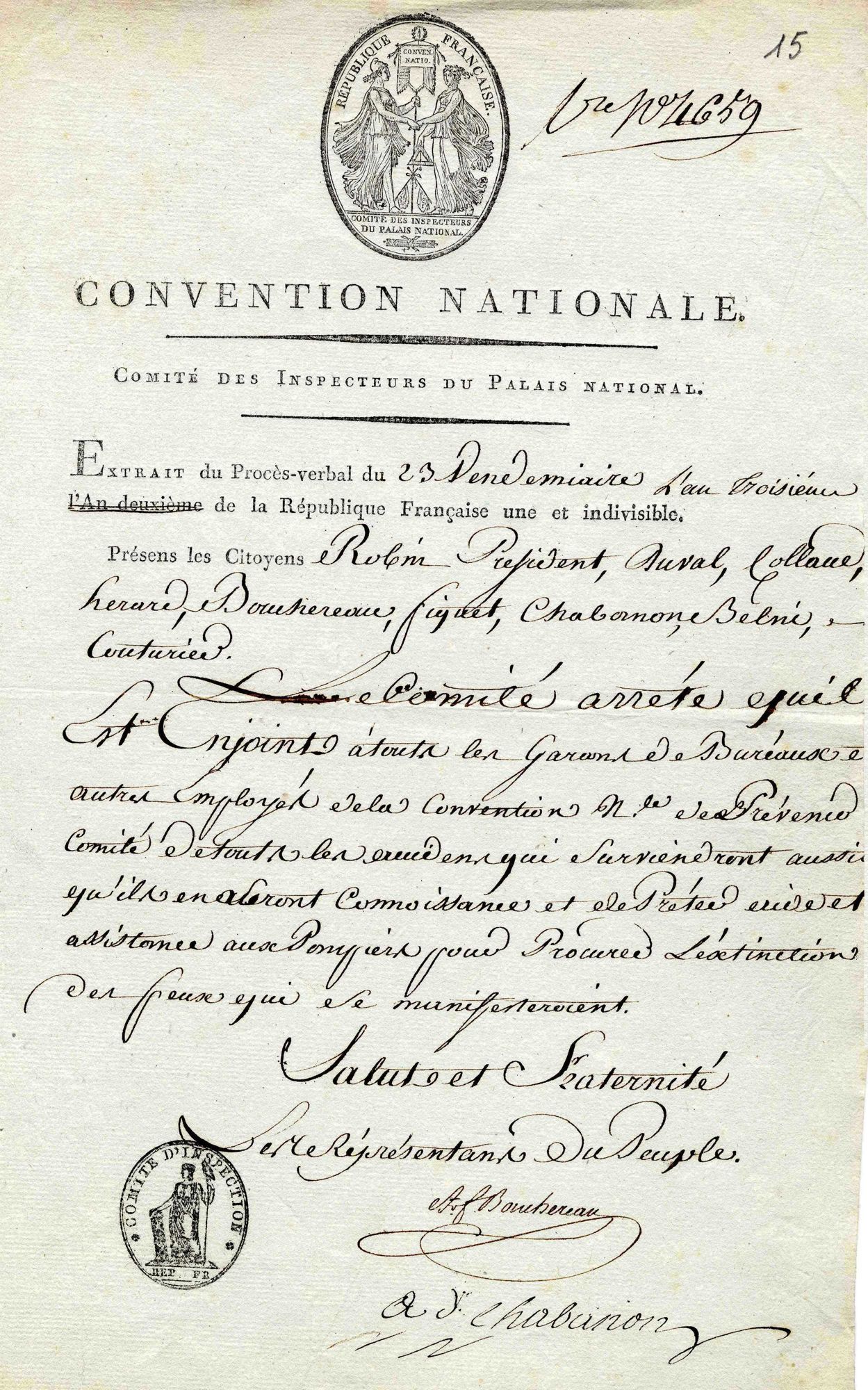 27 J 190-15, Arrêté de la Convention, Comité d'inspection du Palais national, signé de Chabanon (23 Vendémiaire An III ; feuille à en-tête imprimé, 2 cachets imprimés)27 J 190-15, Arrêté de la Convention, Comité d'inspection du Palais national, signé de Chabanon (23 Vendémiaire An III ; feuille à en-tête imprimé, 2 cachets imprimés)27 J 190-15, Arrêté de la Convention, Comité d'inspection du Palais national, signé de Chabanon (23 Vendémiaire An III ; feuille à en-tête imprimé, 2 cachets imprimés)