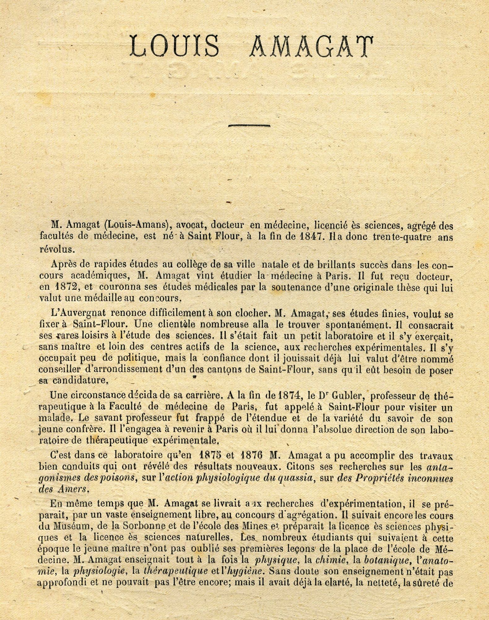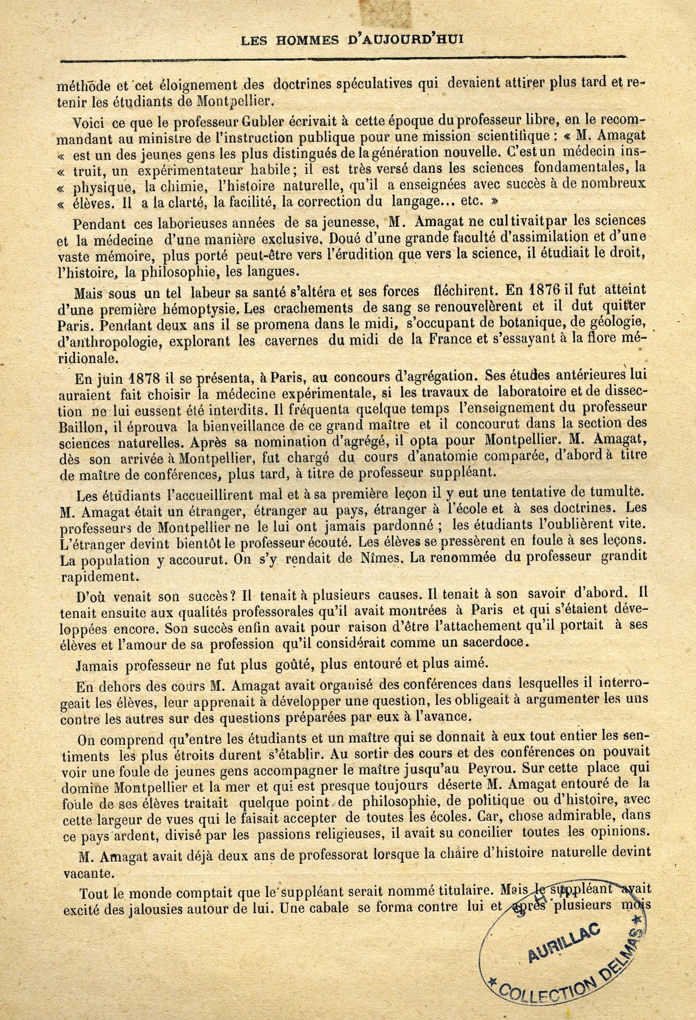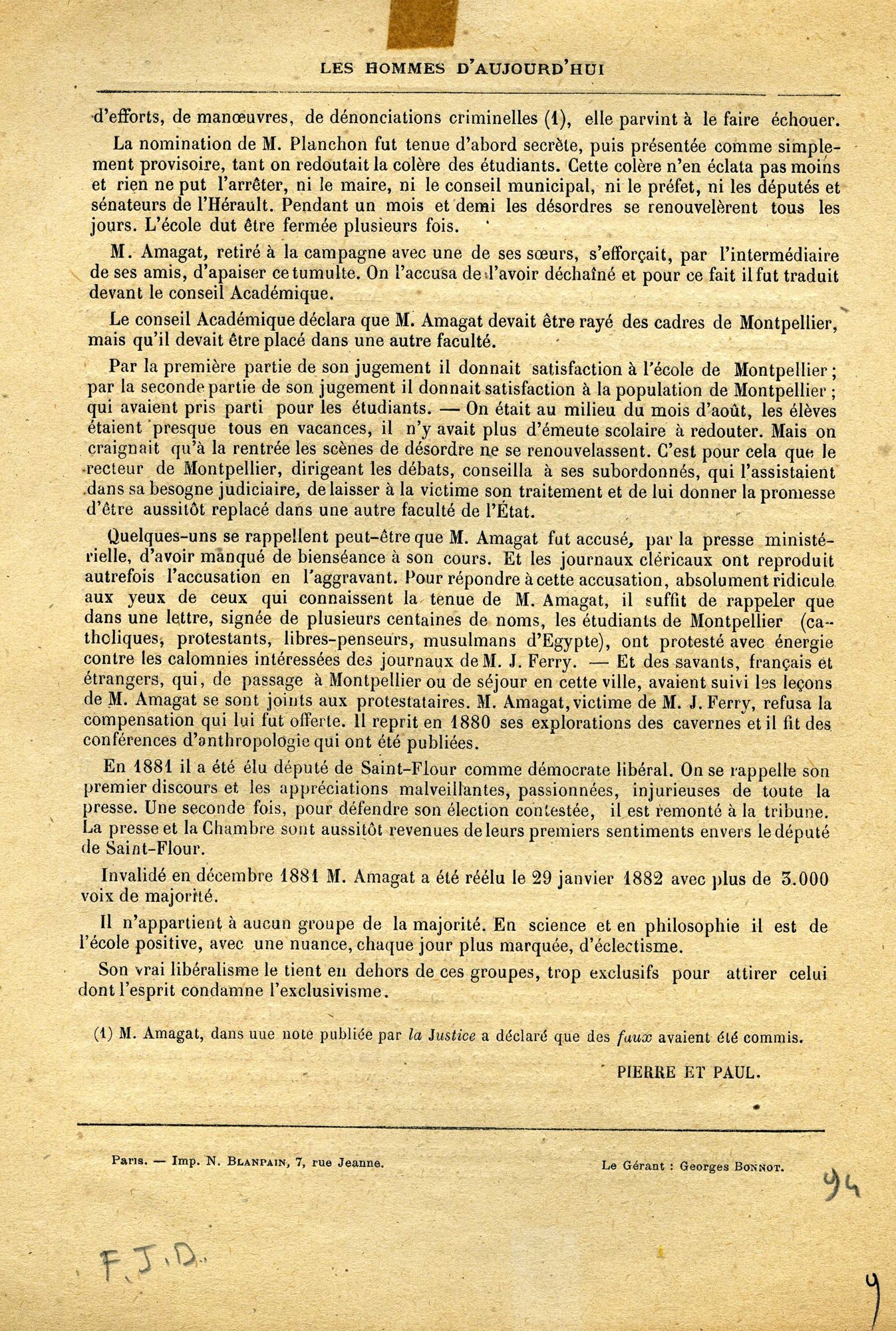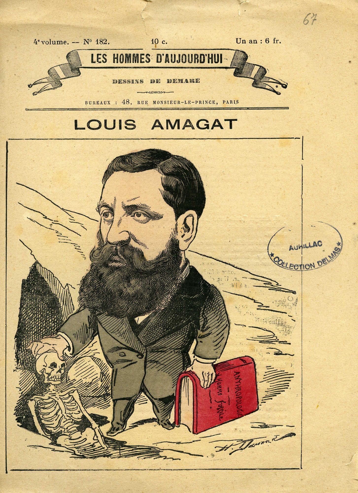 27 J 192-67, Amagat (Louis) : notice biographique, jusqu'en 1882 ("Les hommes d'aujourd'hui", n° 182, s.d. (1882), 4 pages, 1 portrait humoristique). - Dessin signé H. Demard. - Couleur