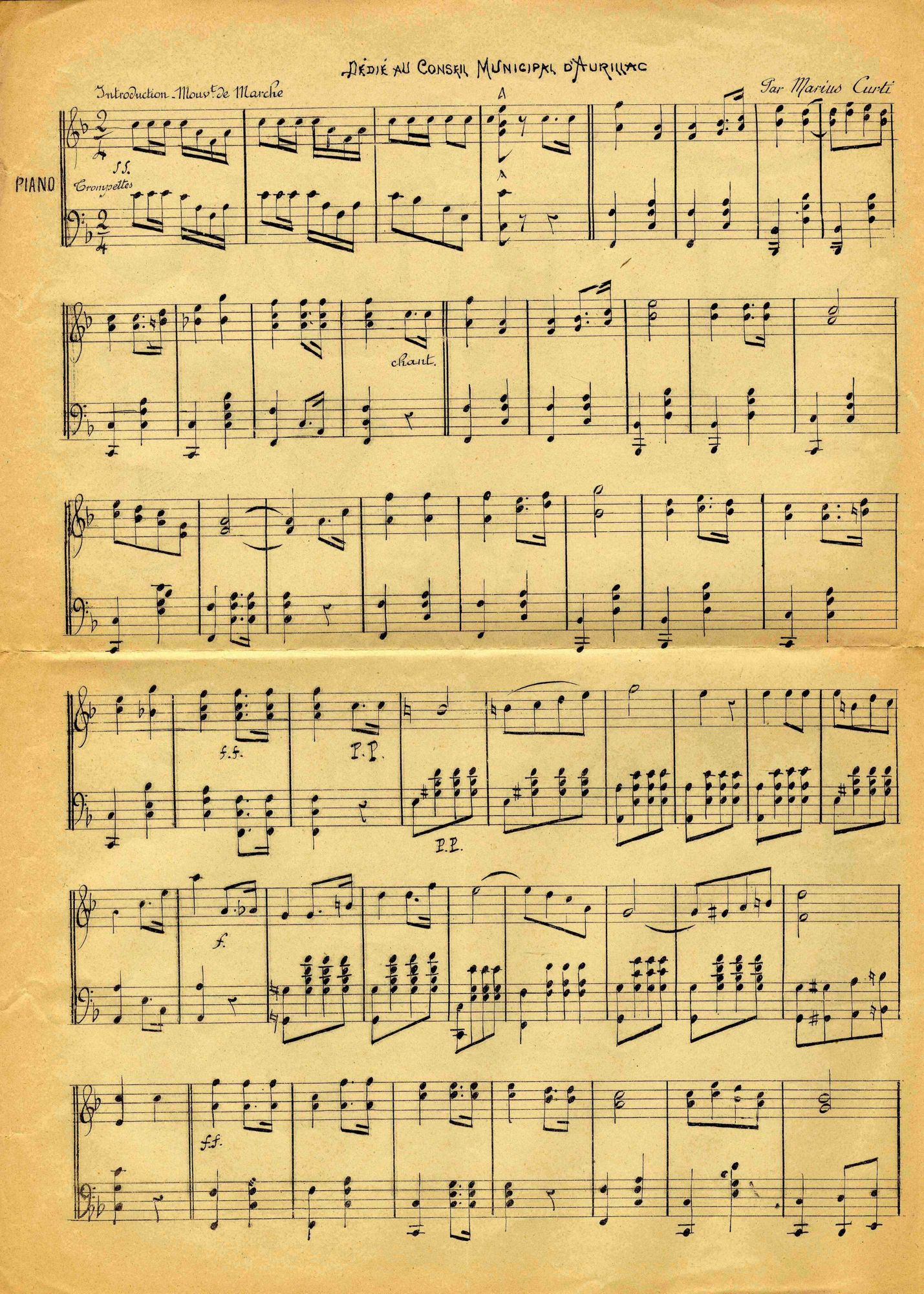 27 J 235-104, "12 Avril 1896. Aurillac cavalcade. Marche triomphale pour piano. Musique de Marius Curti" : partition de musique illustrée. - Aurillac, impr. Moderne. - Noir et blanc