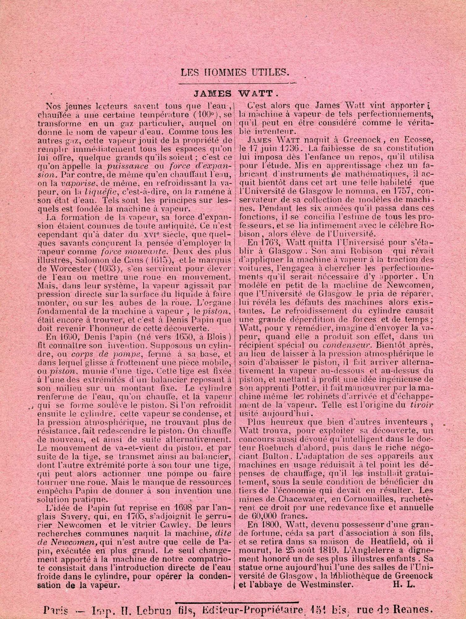 27 J 1-273 - Documents iconographiques issus de la collection Delmas (27 J) - XIVe siècle-sans date 27 J 259 27 J 259-16 - Les hommes utiles : James Watt. - Collection Lebrun. - Noir et blanc - [vers 1900] 27 J 259-16, Les hommes utiles : James Watt. - Collection Lebrun. - Noir et blanc 27 J 259-16, Les hommes utiles : James Watt. - Collection Lebrun. - Noir et blanc Cote 27 J 259-16 Date [vers 1900] Mots-clés matière Physique Cahier d'écolier Mots-clés personne Watt, James (1736-1819) Permalien de la notice https://archives.cantal.fr:443/ark:16075/a011343123394Aq8Z52.moteur=arko_default_5fbd06a9ae86c