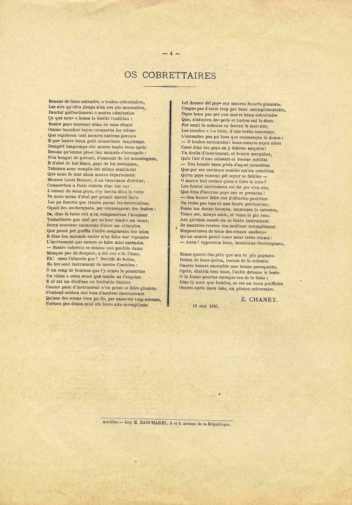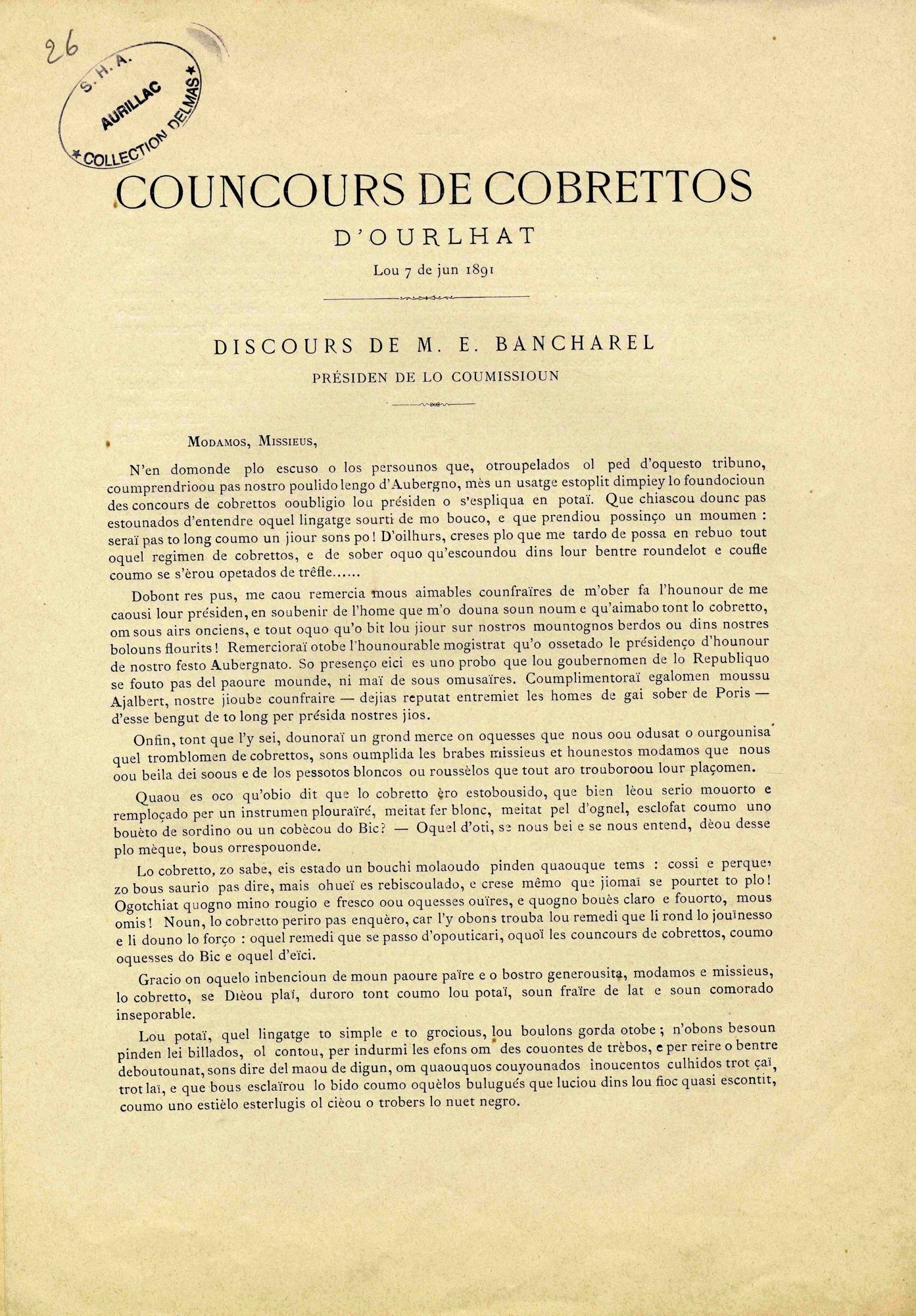 27 J 261-26, Joueur de musette, illustration de la page de titre de "Concours de cobrettos d'Ourlhat, lou 7 de Jun 1891" (Aurillac, impr. Bancharel, 4 pages), comprenant : "Discours de M. E. Bancharel, présden de lo coumissioum" (en patois) ; "Os cobretaïre", poème patois d'A. Vermenouze ; "Os cobrettaires", poème patois de Z. Chanet27 J 261-26, Joueur de musette, illustration de la page de titre de "Concours de cobrettos d'Ourlhat, lou 7 de Jun 1891" (Aurillac, impr. Bancharel, 4 pages), comprenant : "Discours de M. E. Bancharel, présden de lo coumissioum" (en patois) ; "Os cobretaïre", poème patois d'A. Vermenouze ; "Os cobrettaires", poème patois de Z. Chanet27 J 261-26, Joueur de musette, illustration de la page de titre de "Concours de cobrettos d'Ourlhat, lou 7 de Jun 1891" (Aurillac, impr. Bancharel, 4 pages), comprenant : "Discours de M. E. Bancharel, présden de lo coumissioum" (en patois) ; "Os cobretaïre", poème patois d'A. Vermenouze ; "Os cobrettaires", poème patois de Z. Chanet27 J 261-26, Joueur de musette, illustration de la page de titre de "Concours de cobrettos d'Ourlhat, lou 7 de Jun 1891" (Aurillac, impr. Bancharel, 4 pages), comprenant : "Discours de M. E. Bancharel, présden de lo coumissioum" (en patois) ; "Os cobretaïre", poème patois d'A. Vermenouze ; "Os cobrettaires", poème patois de Z. Chanet27 J 261-26, Joueur de musette, illustration de la page de titre de "Concours de cobrettos d'Ourlhat, lou 7 de Jun 1891" (Aurillac, impr. Bancharel, 4 pages), comprenant : "Discours de M. E. Bancharel, présden de lo coumissioum" (en patois) ; "Os cobretaïre", poème patois d'A. Vermenouze ; "Os cobrettaires", poème patois de Z. Chanet