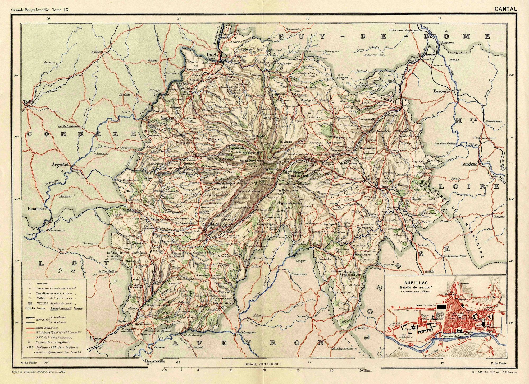 27 J 263-18, Carte du Cantal (avec un plan d'Aurillac). - Gravée et imprimée par Erhard frères, Paris : éditions H. Lamirault et Cie. - Couleur