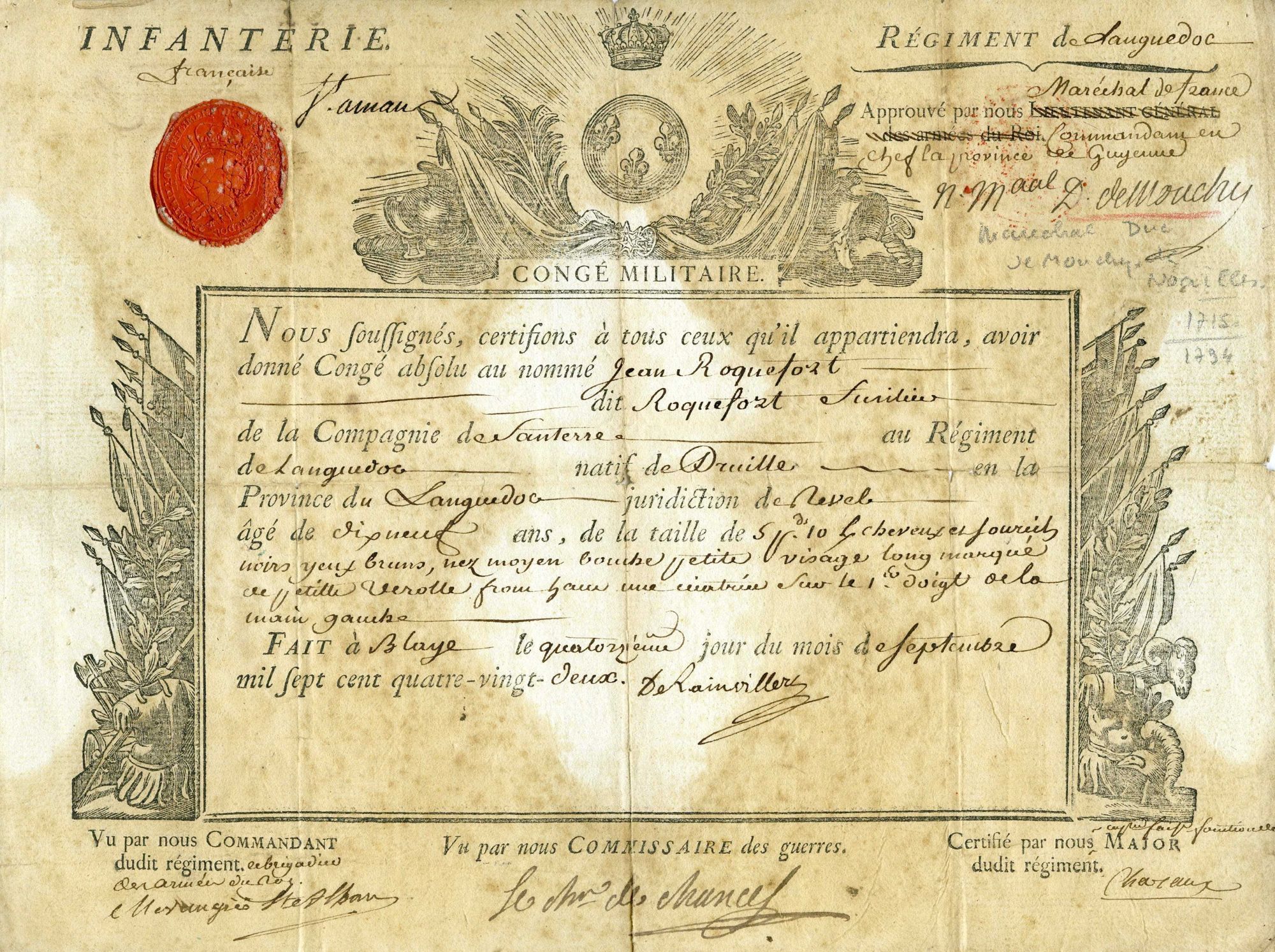 27 NUM 22, Congé militaire donné à Jean Roquefort, fusilier de la compagnie de Sancerre au régiment de Languedoc, approuvé par le maréchal duc de Mouchy, commandant en chef de la province de Guyenne27 NUM 22, Congé militaire donné à Jean Roquefort, fusilier de la compagnie de Sancerre au régiment de Languedoc, approuvé par le maréchal duc de Mouchy, commandant en chef de la province de Guyenne27 NUM 22, Congé militaire donné à Jean Roquefort, fusilier de la compagnie de Sancerre au régiment de Languedoc, approuvé par le maréchal duc de Mouchy, commandant en chef de la province de Guyenne