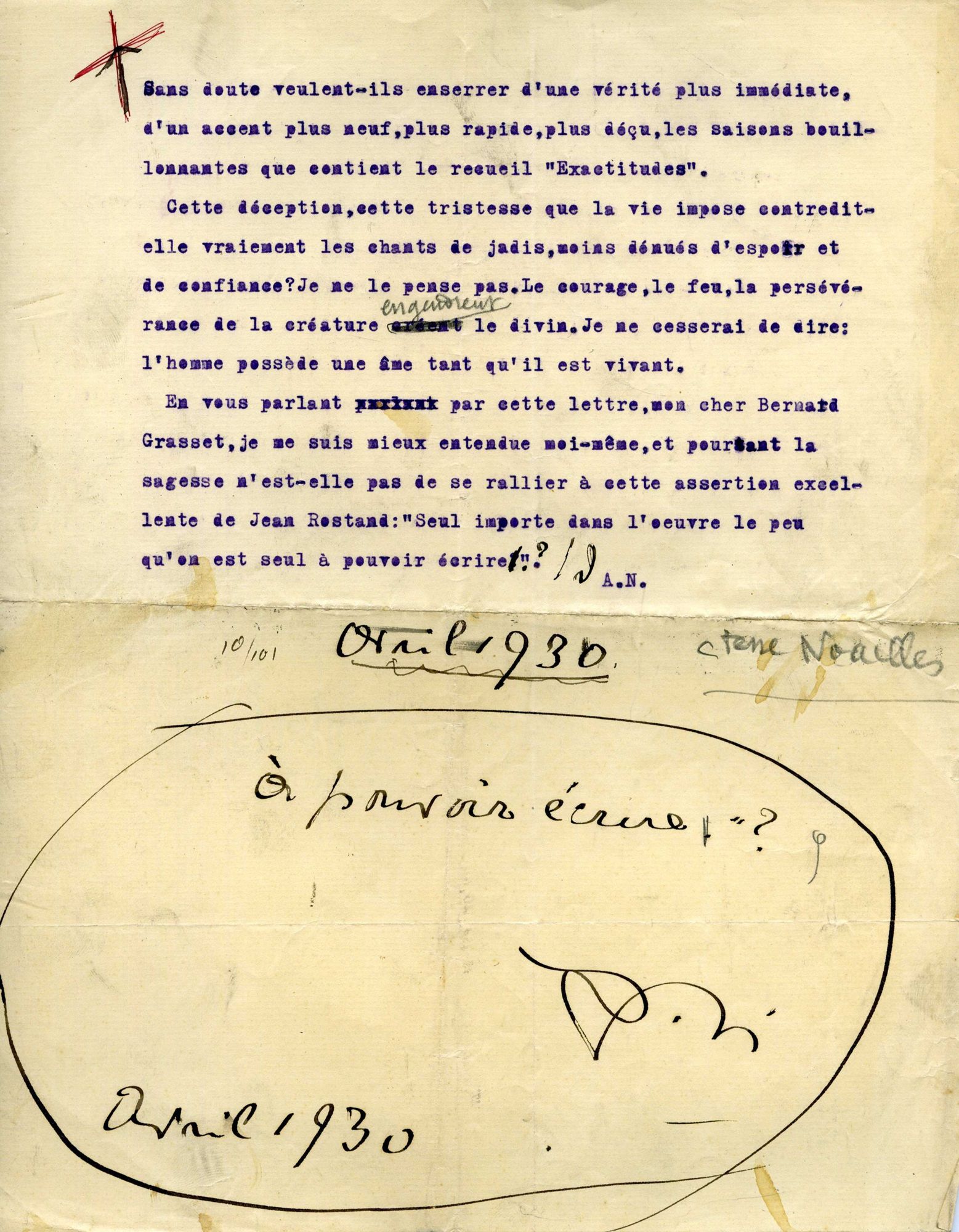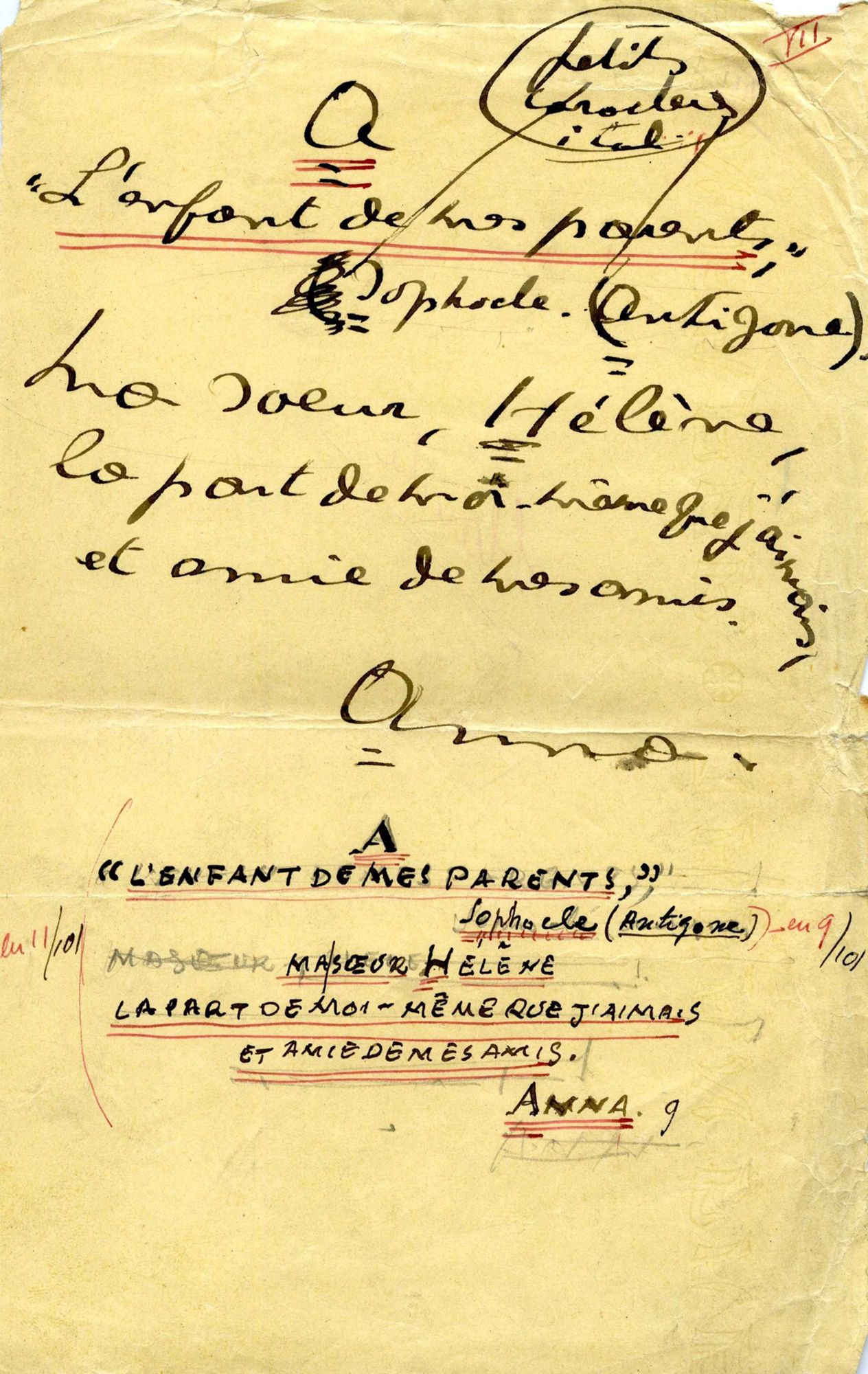 27 NUM 24, Deux textes d'Anna de Noailles : fin d'une lettre dactylographiée à Bernard Grasset (avril 1930) ; feuille manuscrite destinée à l'imprimeur "A l'enfant de mes parents Sophocle (Antigone). Ma soeur Hélène, la part de moi-même que j'aimais et amie de mes amis. Anna"27 NUM 24, Deux textes d'Anna de Noailles : fin d'une lettre dactylographiée à Bernard Grasset (avril 1930) ; feuille manuscrite destinée à l'imprimeur "A l'enfant de mes parents Sophocle (Antigone). Ma soeur Hélène, la part de moi-même que j'aimais et amie de mes amis. Anna"