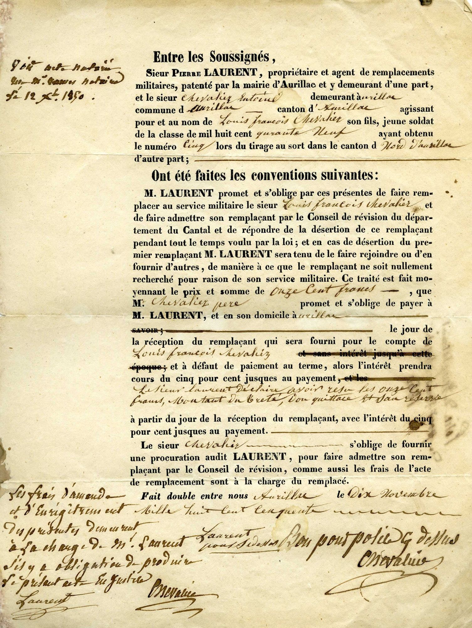 27 NUM 28, Conventions de remplacement au service militaire faites entre Pierre Laurent, agent de remplacements militaires patenté par la mairie d'Aurillac, et Antoine Chevalier, d'Aurillac, pour et au nom de son fils Louis-François Chevalier (classe 1842), pour la somme de 1.100 francs27 NUM 28, Conventions de remplacement au service militaire faites entre Pierre Laurent, agent de remplacements militaires patenté par la mairie d'Aurillac, et Antoine Chevalier, d'Aurillac, pour et au nom de son fils Louis-François Chevalier (classe 1842), pour la somme de 1.100 francs27 NUM 28, Conventions de remplacement au service militaire faites entre Pierre Laurent, agent de remplacements militaires patenté par la mairie d'Aurillac, et Antoine Chevalier, d'Aurillac, pour et au nom de son fils Louis-François Chevalier (classe 1842), pour la somme de 1.100 francs27 NUM 28, Conventions de remplacement au service militaire faites entre Pierre Laurent, agent de remplacements militaires patenté par la mairie d'Aurillac, et Antoine Chevalier, d'Aurillac, pour et au nom de son fils Louis-François Chevalier (classe 1842), pour la somme de 1.100 francs27 NUM 28, Conventions de remplacement au service militaire faites entre Pierre Laurent, agent de remplacements militaires patenté par la mairie d'Aurillac, et Antoine Chevalier, d'Aurillac, pour et au nom de son fils Louis-François Chevalier (classe 1842), pour la somme de 1.100 francs