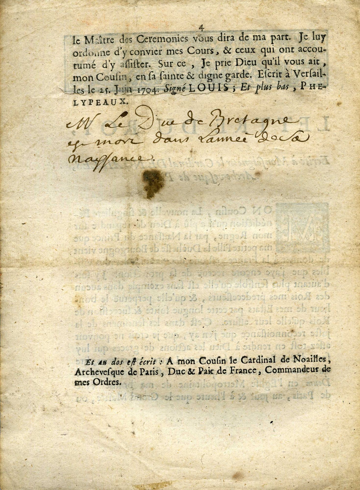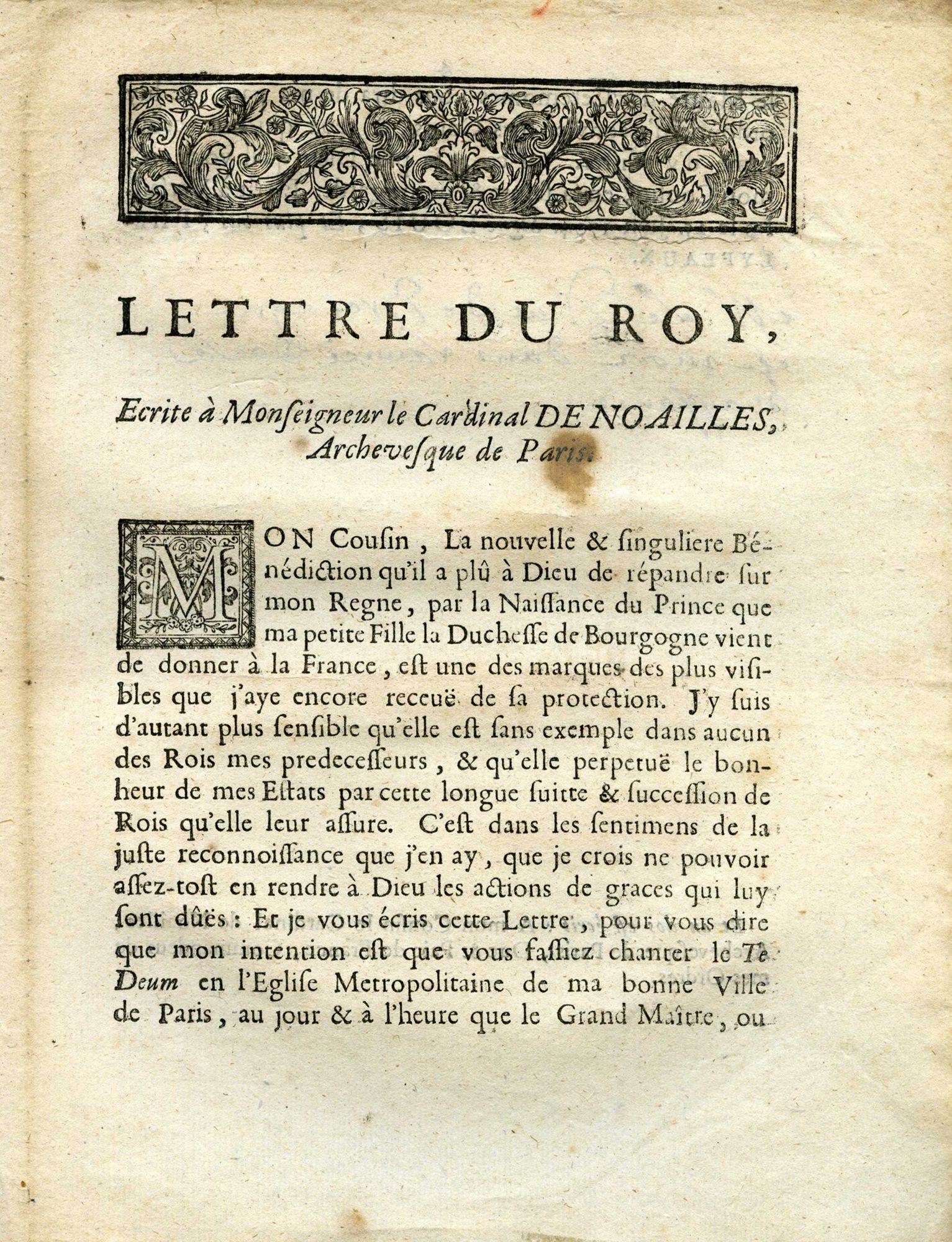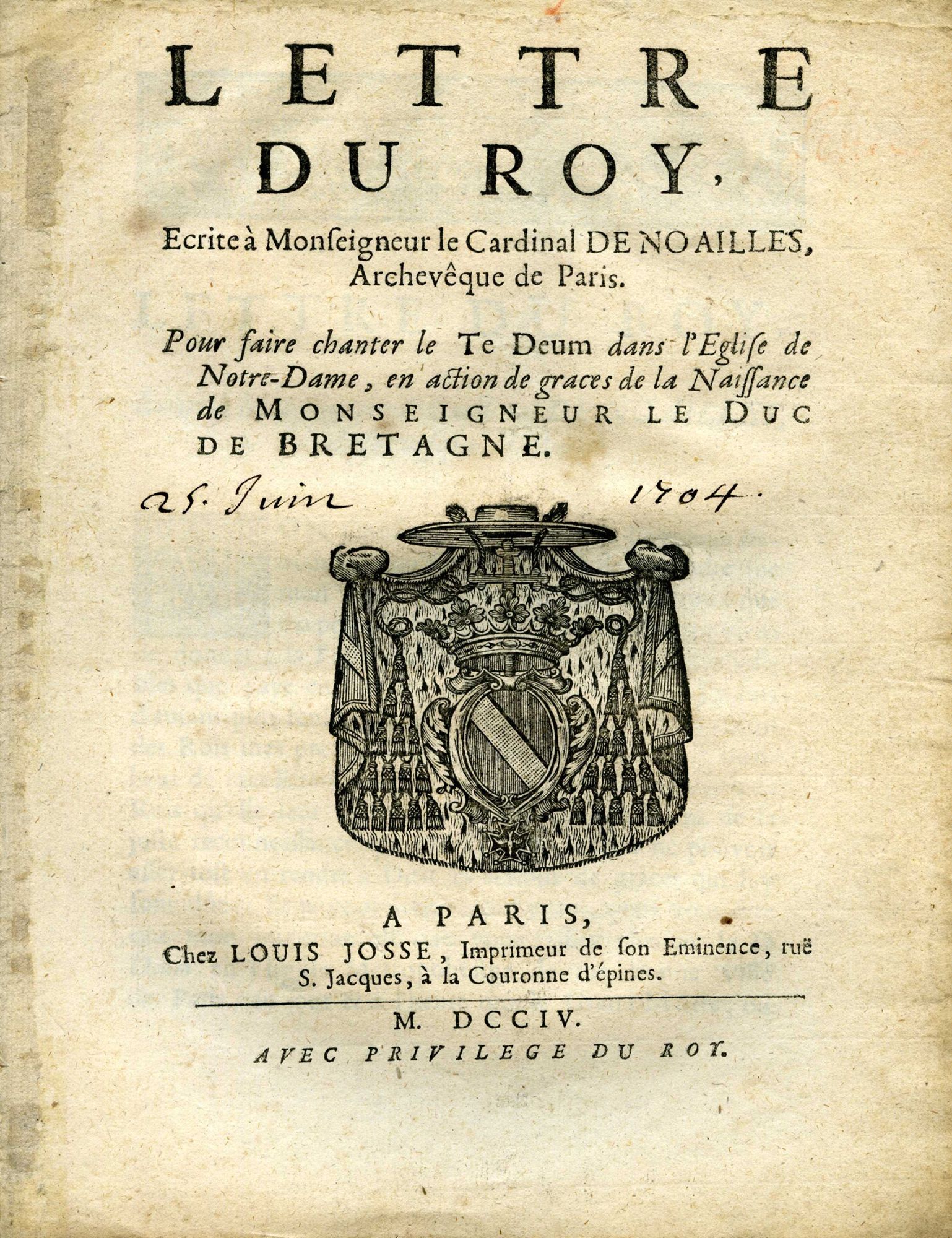 27 NUM 7, "Lette du Roy ecrite à Monseigneur le Cardinal de Noailles, Archeveque de Paris, pour faire chanter le Te Deum dans l'Église de Notre-Dame, en action de grace de la naissance de Monseigneur le Duc de Bretagne". Paris, Louis Josse, 1704.27 NUM 7, "Lette du Roy ecrite à Monseigneur le Cardinal de Noailles, Archeveque de Paris, pour faire chanter le Te Deum dans l'Église de Notre-Dame, en action de grace de la naissance de Monseigneur le Duc de Bretagne". Paris, Louis Josse, 1704.27 NUM 7, "Lette du Roy ecrite à Monseigneur le Cardinal de Noailles, Archeveque de Paris, pour faire chanter le Te Deum dans l'Église de Notre-Dame, en action de grace de la naissance de Monseigneur le Duc de Bretagne". Paris, Louis Josse, 1704.27 NUM 7, "Lette du Roy ecrite à Monseigneur le Cardinal de Noailles, Archeveque de Paris, pour faire chanter le Te Deum dans l'Église de Notre-Dame, en action de grace de la naissance de Monseigneur le Duc de Bretagne". Paris, Louis Josse, 1704.