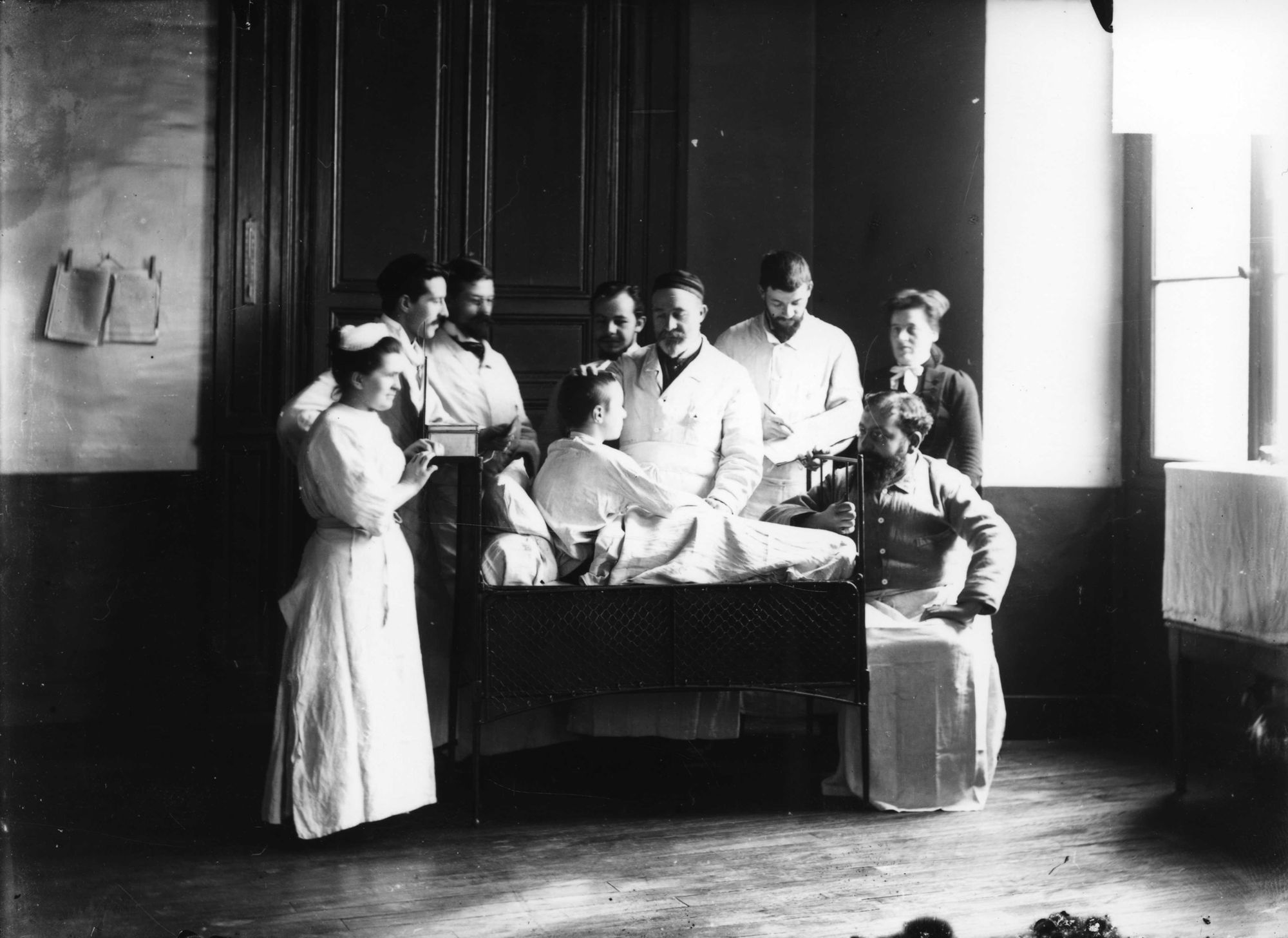 36 Fi 15 - Vue d'un groupe de personnes, dont le professeur Josias, autour d'un lit occupé par un jeune homme souffrant. Cliché pris à l'hôpital Trousseau dans le 12e arrondissement de Paris. - 13 x 18 cm. - 1899
