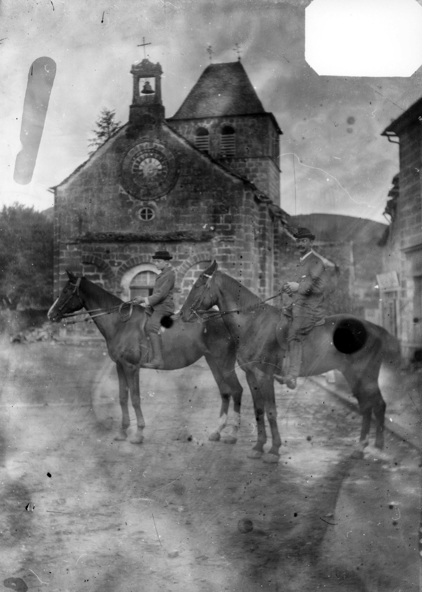 36 Fi 19, Portrait de deux hommes à cheval, René et Raoul de Ribier, respectivement cousin et frère de Louis de Ribier, devant l'église de Saignes. - 13 x 18 cm.