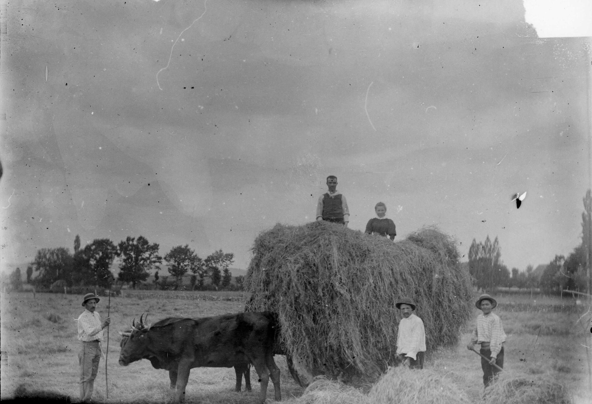 36 Fi 26, Scène de fenaison à Saignes : des paysans posent autour d'un char à boeuf rempli de foin. - 13 x 18 cm.