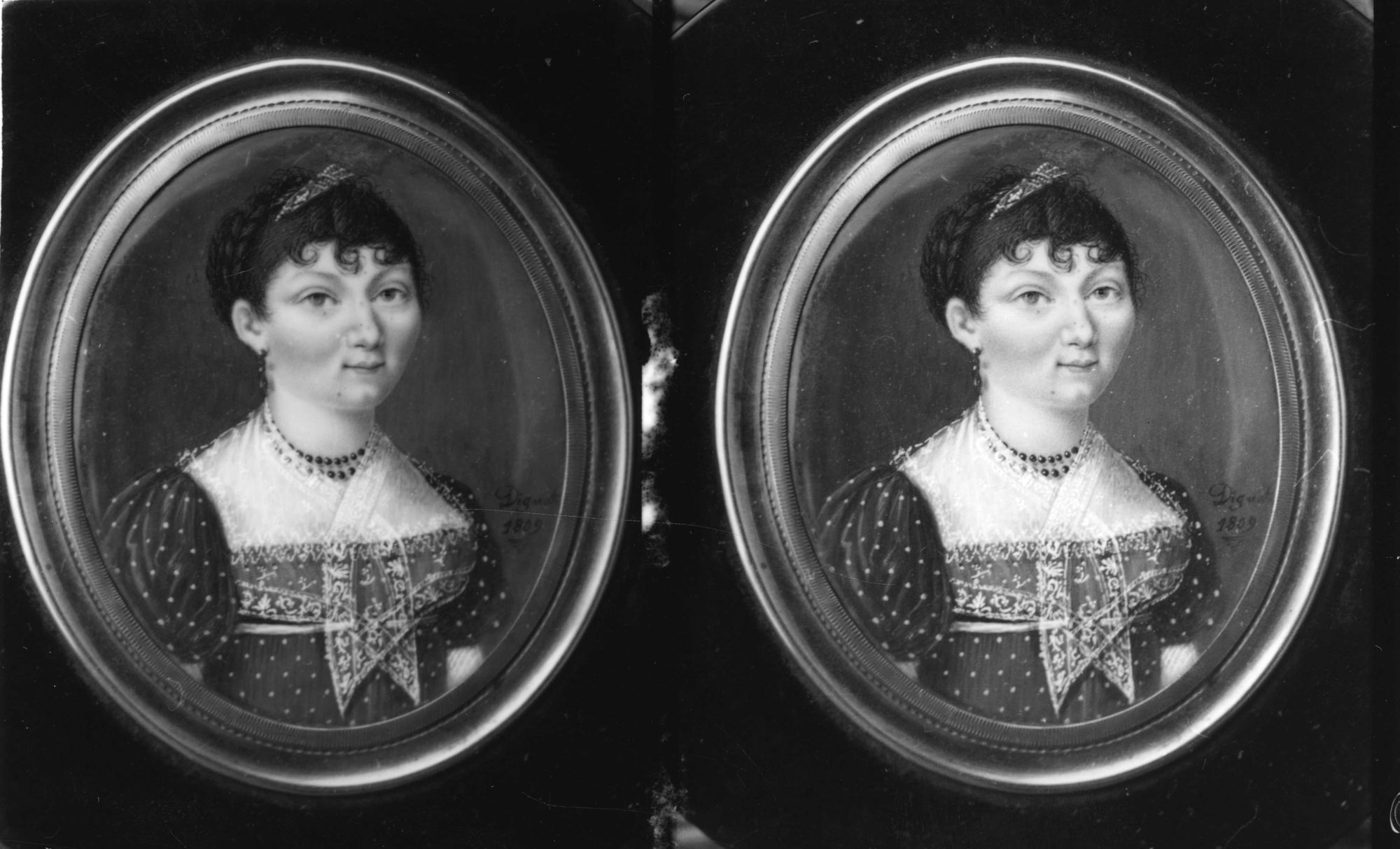 36 Fi 60, Vue stéréoscopique d'un portrait en médaillon d'une femme non identifiée, signé Diguat en 1809. - 13 x 18 cm.