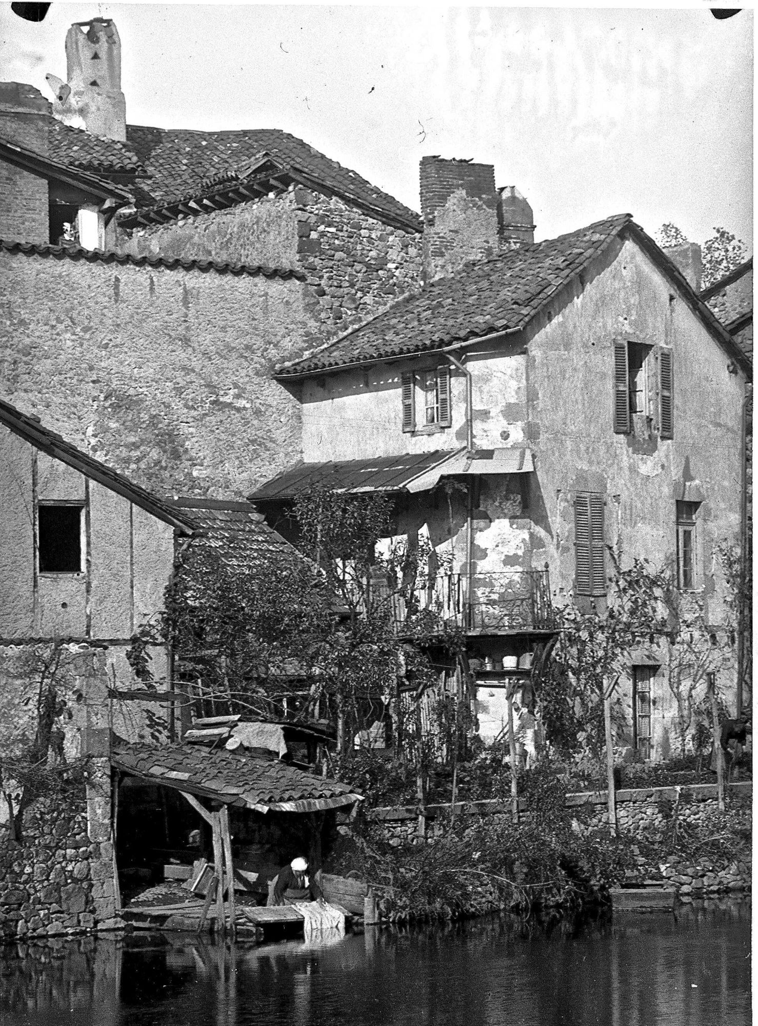 36 NUM 97-98, Vieilles maisons sur la Jordanne : femme lavant du linge