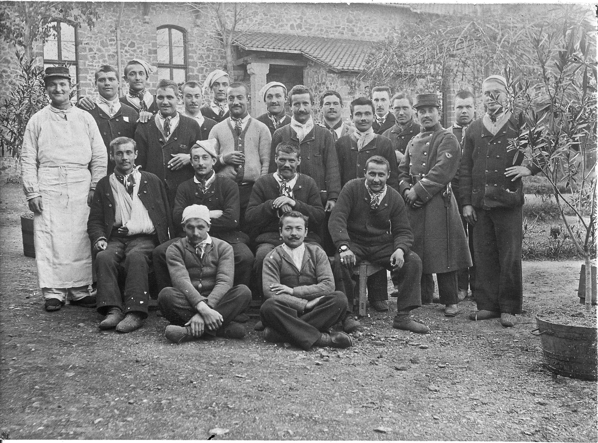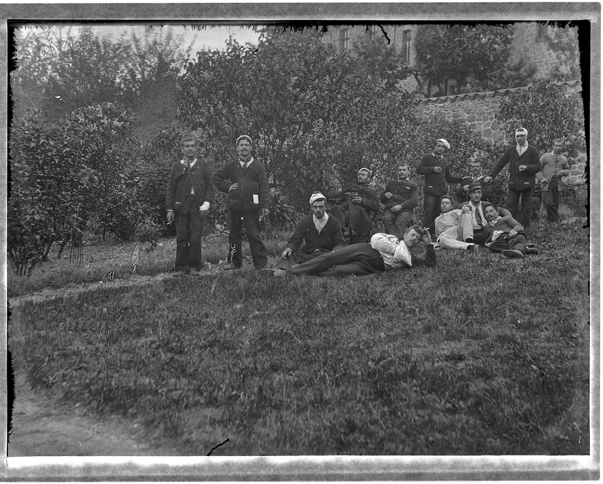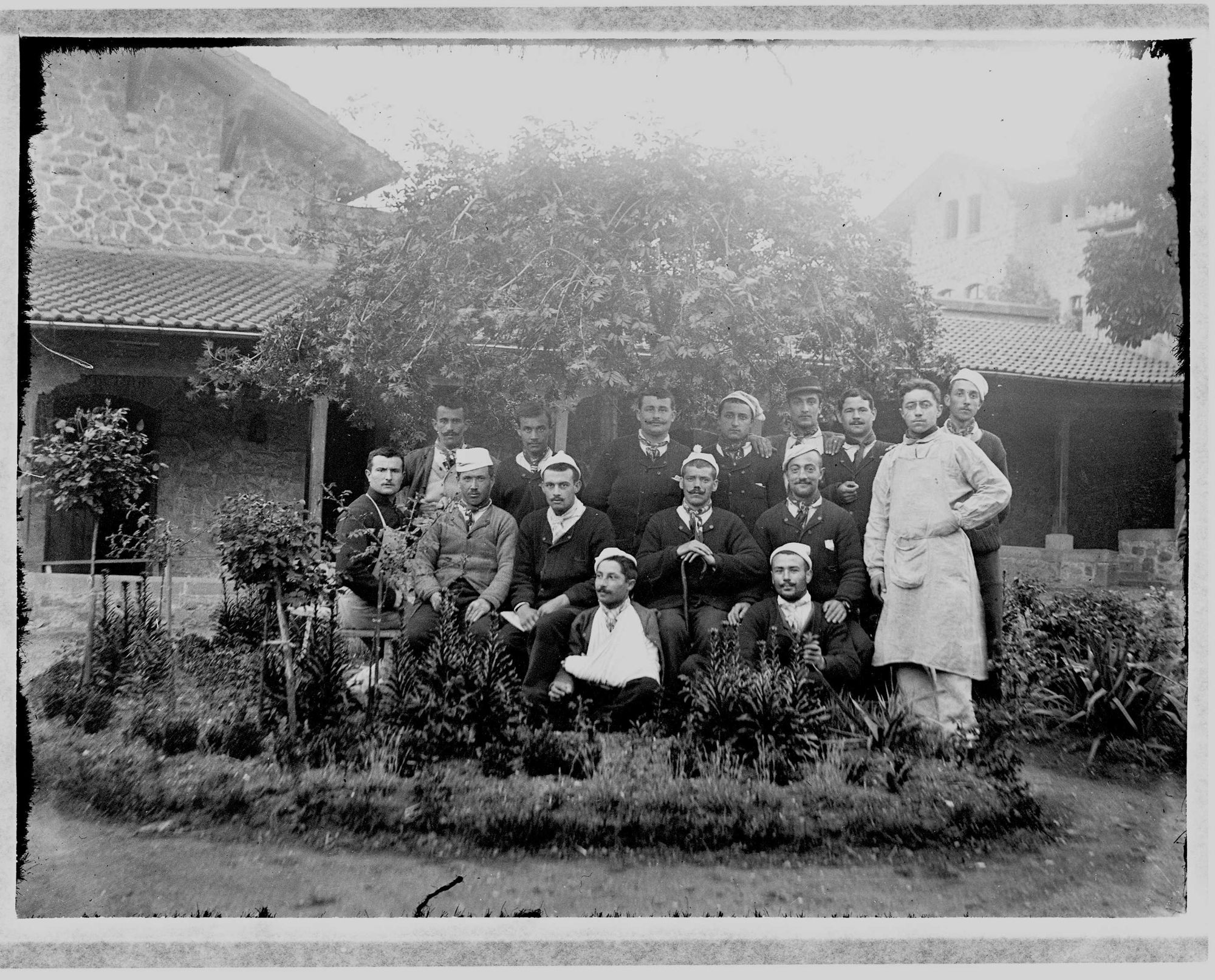 36 NUM 255-258, Groupe de militaires en convalescence prenant la pose dans les jardins de l'hôpital
