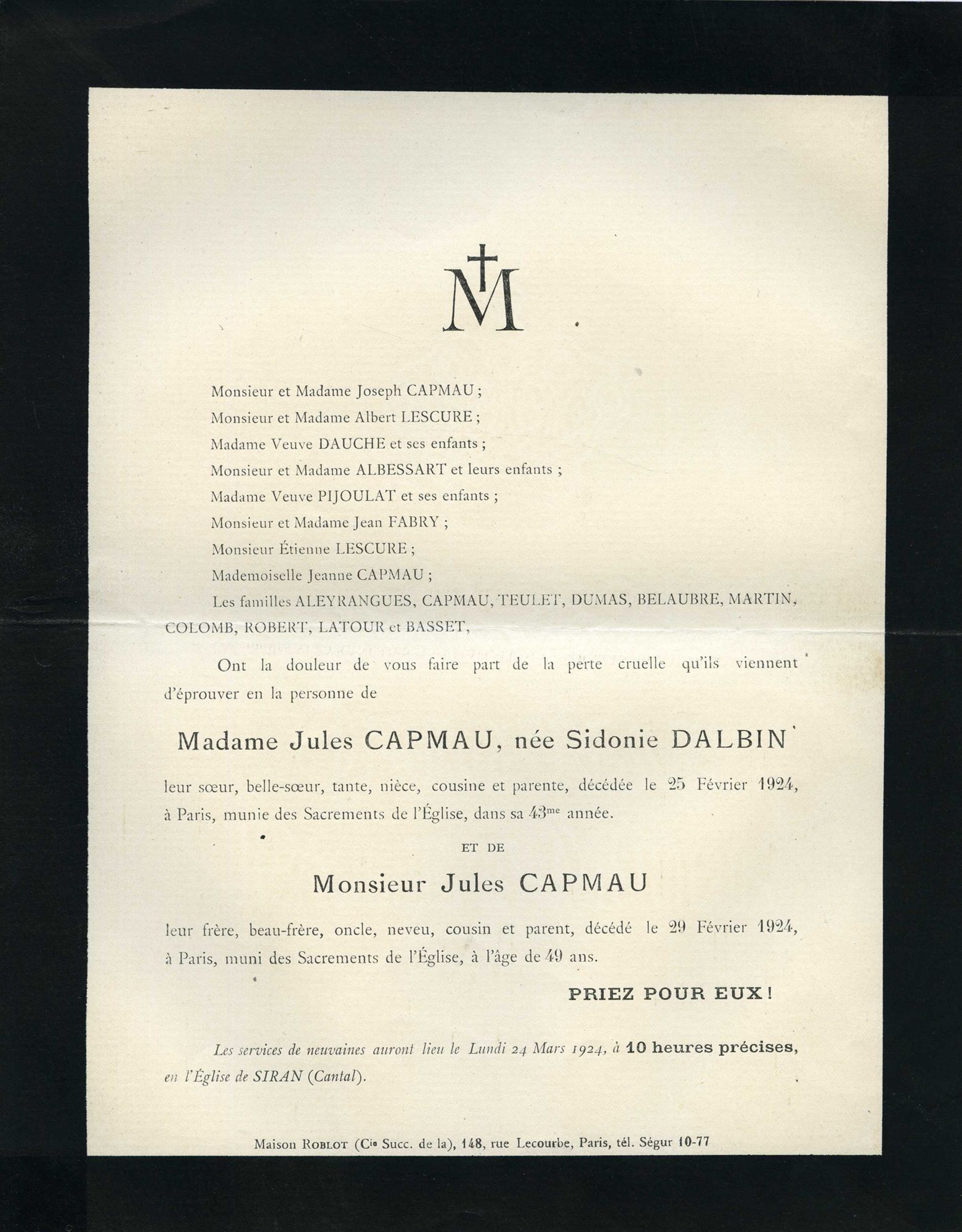 39 NUM 1-191 - Fonds Guy Sarrauste de Menthière - XVIIe siècle-2011 Imprimés Faire-part de décès (famille, amis, relations du sud-ouest du Cantal) 39 NUM 147 - Madame Jules Capmau née Sidonie Dalbin (1881-1924) et monsieur Jules Capmau (1875-1924) - 1924 39 NUM 147, Madame Jules Capmau née Sidonie Dalbin (1881-1924) et monsieur Jules Capmau (1875-1924) Cote 39 NUM 147 Date 1924 Mots-clés matière Faire-part Décès Mots-clés personne Sarrauste de Menthière (famille) Dalbin, Sidonie (1881-1924) Capmau, Sidonie (1881-1924) Capmau, Jules (1881-1924) Permalien de la notice https://archives.cantal.fr:443/ark:16075/a011364290138nMDDMd.moteur=arko_default_5fbd06a9ae86c