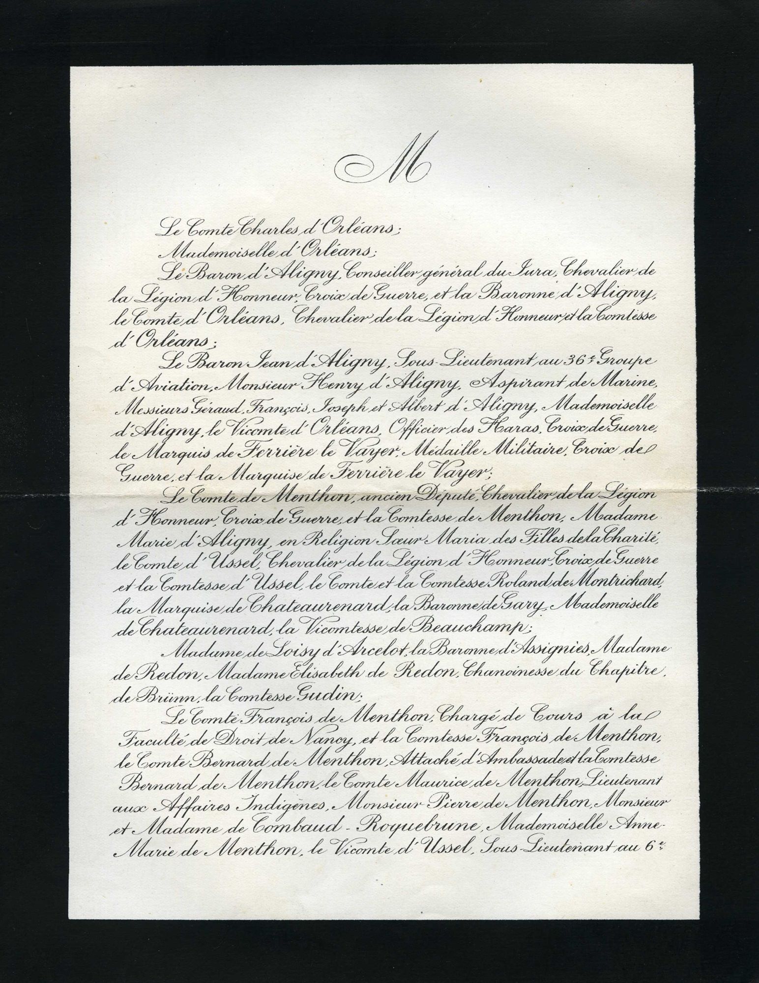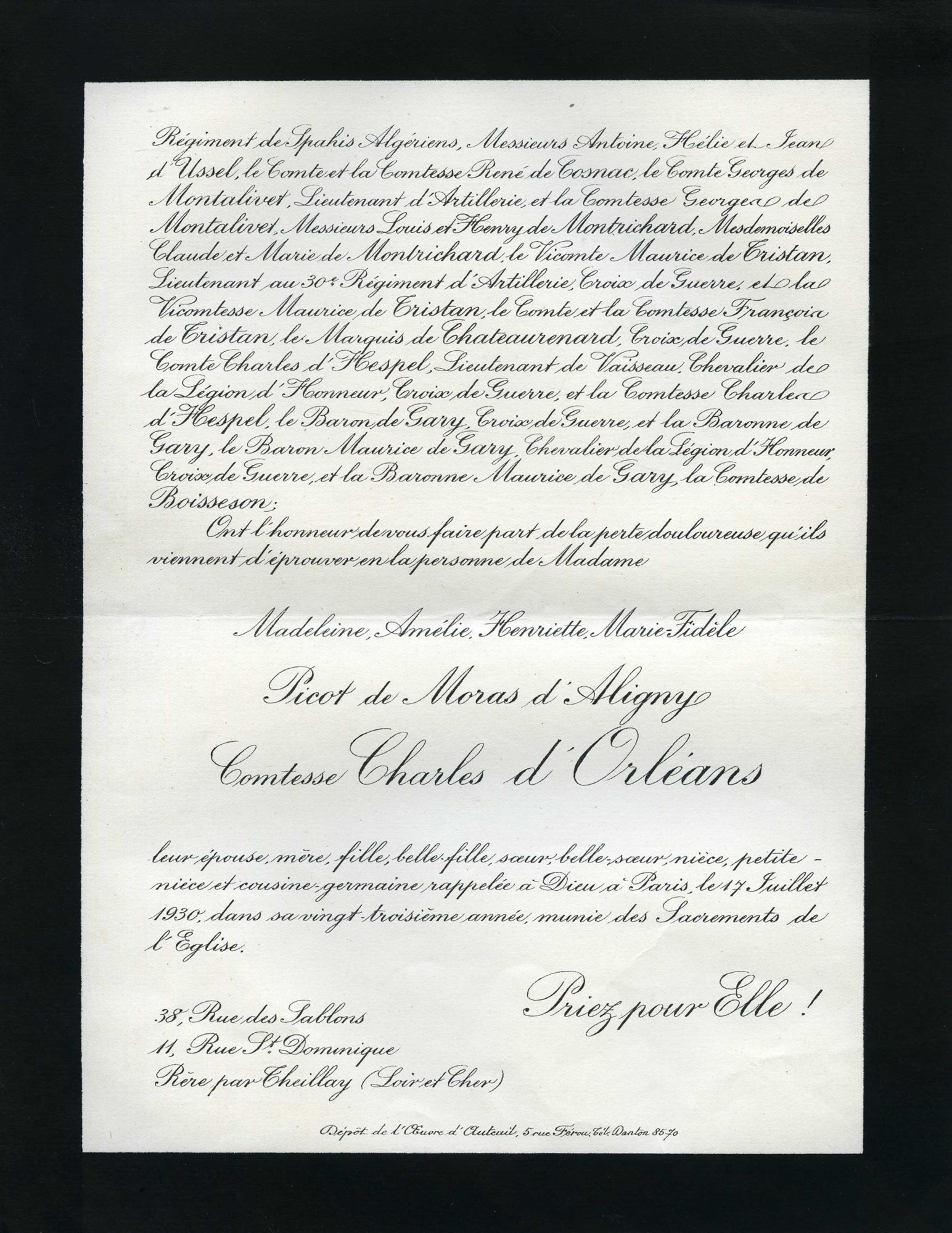 39 NUM 1-191 - Fonds Guy Sarrauste de Menthière - XVIIe siècle-2011 Imprimés Faire-part de décès (famille, amis, relations du sud-ouest du Cantal) 39 NUM 156 - Madeleine Amélie Henriette Marie-Fidèle Picot de Moras d'Aligny, comtesse Charles d'Orléans (1907-1930) - 1928 39 NUM 156, Madeleine Amélie Henriette Marie-Fidèle Picot de Moras d'Aligny, comtesse Charles d'Orléans (1907-1930) 39 NUM 156, Madeleine Amélie Henriette Marie-Fidèle Picot de Moras d'Aligny, comtesse Charles d'Orléans (1907-1930) Cote 39 NUM 156 Date 1928 Mots-clés matière Faire-part Décès Mots-clés personne Sarrauste de Menthière (famille) Picot de Moras d'Aligny, Madeleine Amélie Henriette Marie-Fidèle (1907-1930 ; comtesse Charles d'Orléans) Permalien de la notice https://archives.cantal.fr:443/ark:16075/a011364290138Wzwnux.moteur=arko_default_5fbd06a9ae86c