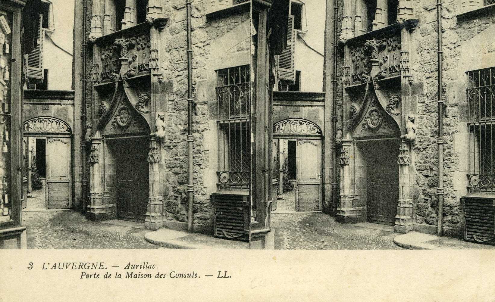 41 Fi 302, Vue stéréoscopique de la porte de la maison consulaire. Le porche à gauche de celle-ci ainsi que le bâtiment ont disparu au moment de la construction du théâtre municipal. - Carte postale, n. et b., 9 x 14 cm.
