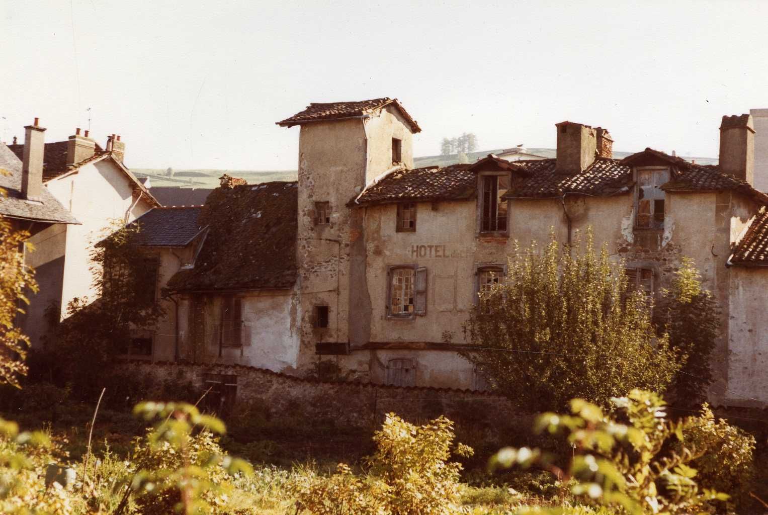 41 Fi 592 - Vue d'un ancien hôtel au coeur de l'îlot Gambetta. Au premier plan, le parc-jardin d'une maison voisine. Cliché pris de la rue Paul Doumer. Après démolition de tous ces bâtiments dans les années 1980, le Conseil général du Cantal a été établi sur cet espace. - Photographie, coul., 9 x 13 cm. - [vers 1980]