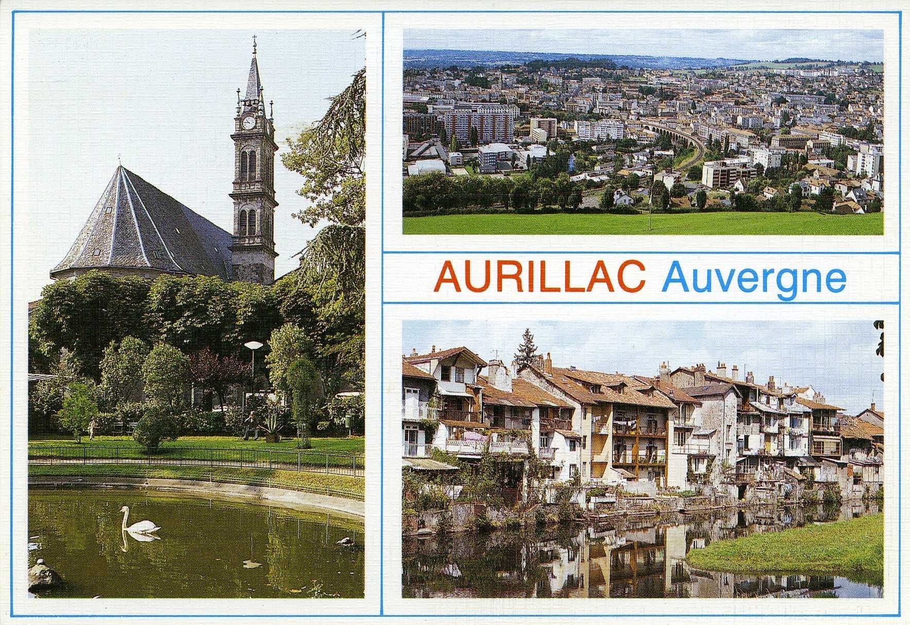 47 Fi 5, "Aurillac (15000) - Alt. 620 m. - Préfecture du Cantal. - Le Square et l'église Notre-Dame aux neiges - Vue générale - Les vieux quartiers sur la Jordanne". - Editions Bos, Ytrac
