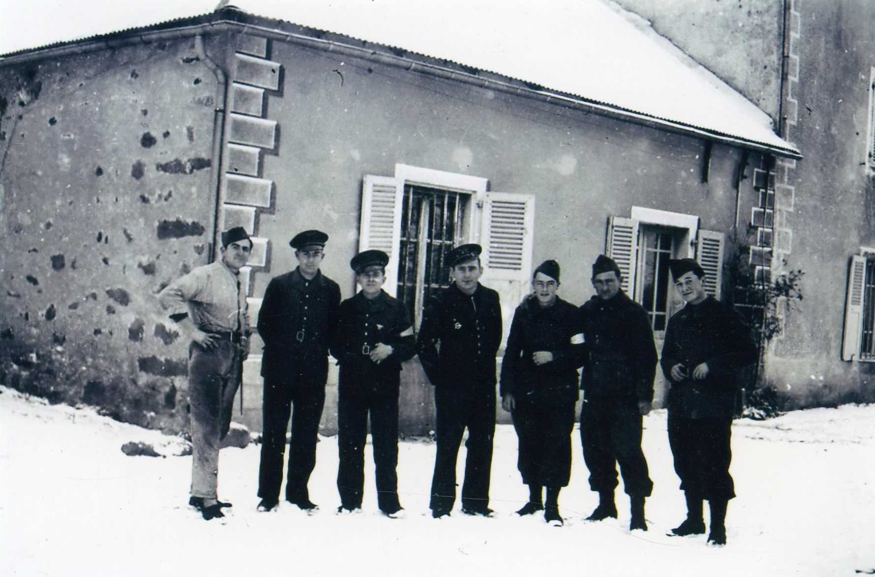 48 Fi 61, Poste de guet à Loubaresse, durant l'hiver. Groupe de 7 hommes devant une habitation. - Photographie, n. b., 15 x 10