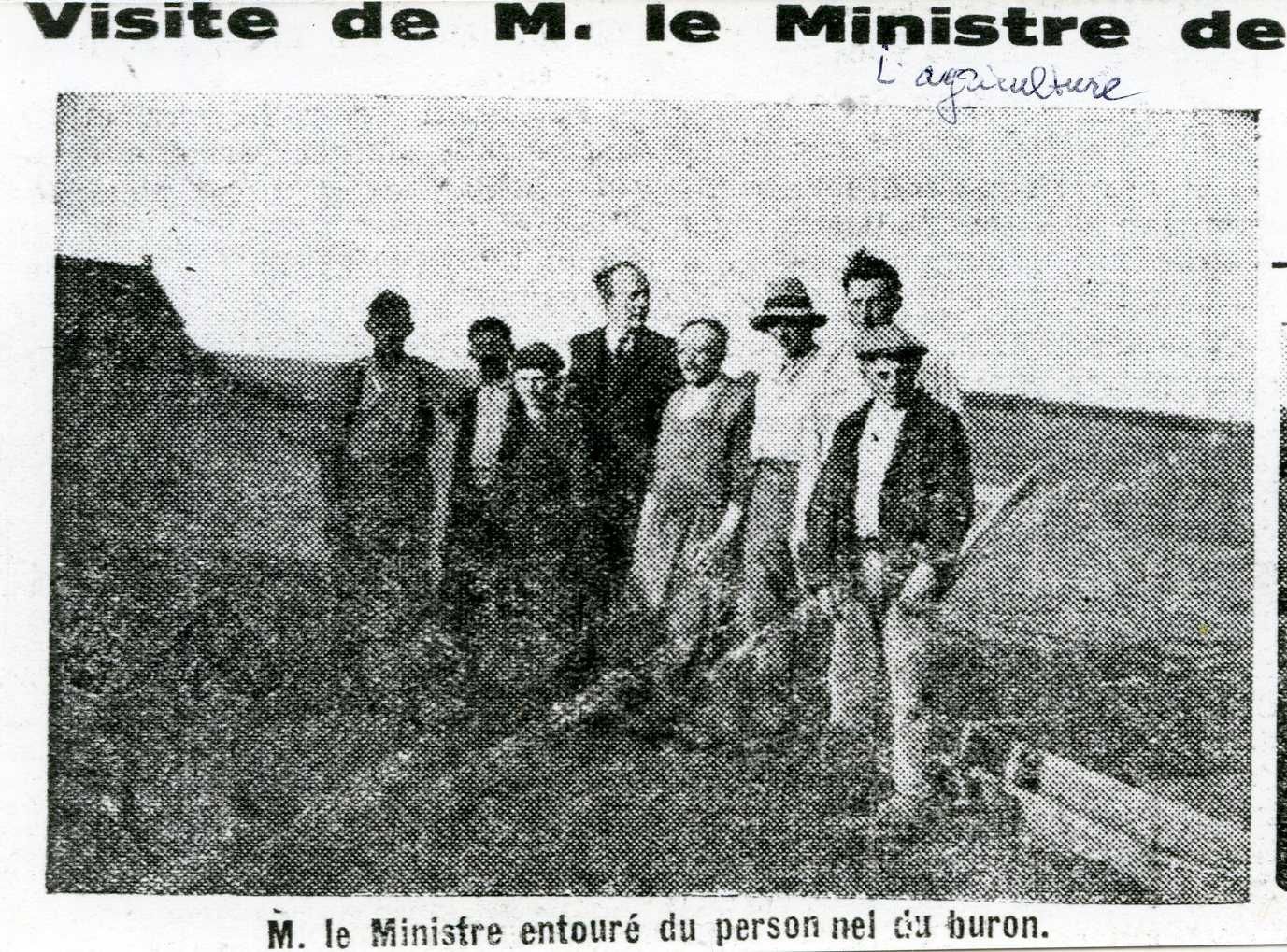 48 Fi 146, Photographie de l'Effort paysan". Visite de Jacques Le Roy Ladurie (1902-1988), ministre de l'agriculture sous le régime de Vichy, puis résistant ; le 21 juin 1942 au buron de M. Prepsat, qui possède une montagne à Vernols. Jacques Le Roy Ladurie se trouve au centre de la photo, il est entouré des vachers du buron. Il visitera ensuite, la cave coopérative des monts d'Auvergne à Saignes. - Photographie, n. et b., 12 x 8,6